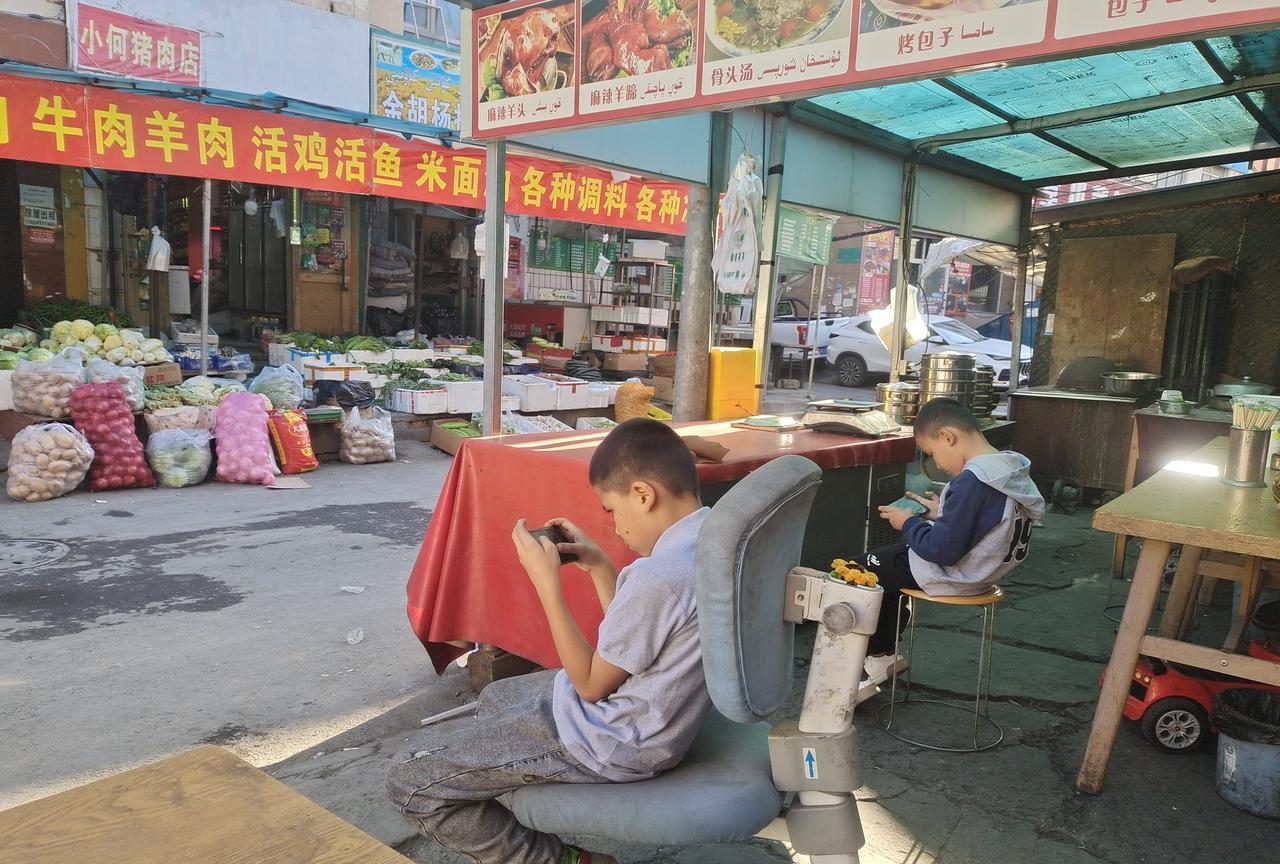 “十一”国庆节,两个小巴郎放假了,到自己家的烤包子店玩耍。因为实在没意思,店里也没有啥需要这两个小家伙帮忙的。于是,这两个小家伙就拿起大人的手机玩游戏,玩儿的是不亦乐乎,半天都没有起身。 现在孩子玩手机游戏已成为普遍现象,因为玩手机游戏比做作业要有意思且轻松愉快的多。