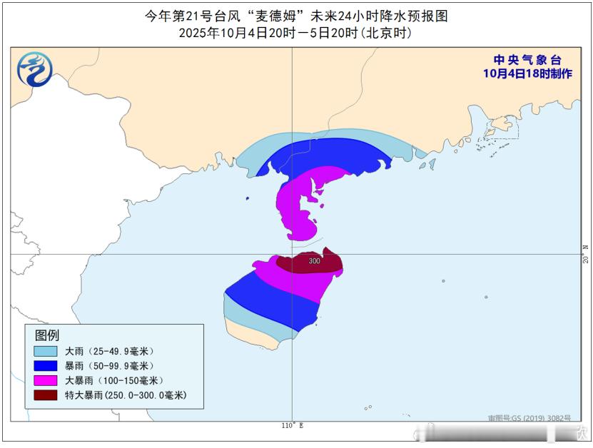 降水预报:4日夜间到5日白天,海南岛大部有大到暴雨,其中海南岛北部有大暴雨,局地特大暴雨(250-300毫米);5日白天,广东西南部、广西东南部有大到暴雨,局地有大暴雨。