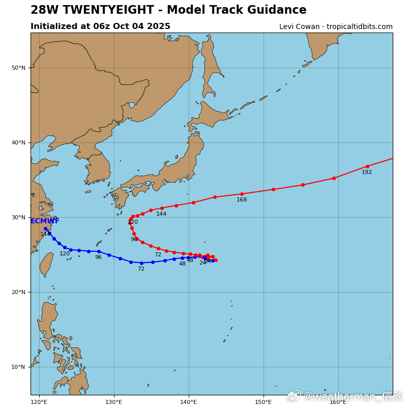 从今天下午-晚上的云图看,除了台风麦德姆,西北太平洋上还有低压发展(原扰动94W)。日本气象厅已经给出了预生成提示,明天将发展为22号台风夏浪。这个台风后期路径具有超级大的不确定性。日本气象厅给出的第5天概率圈也是超级大,与麦德姆确定性很强的细长概率圈,形成鲜明对比。