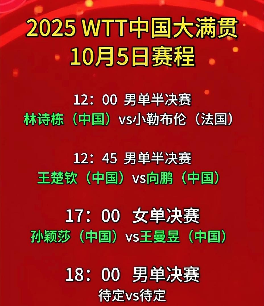 WTT中国大满贯!10月5日女单决赛对阵,男单收官日3场大战10月5日,WTT