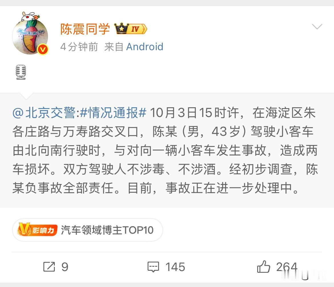 陈震: 我的全部责任! 今天中午,陈震终于等来了,官方对他昨天那场交通事故的情况通报! 他本人也转发了这条通报,并且只是配上了一个喇叭的标志,意思就是让大家知道这个事情是他全部的责任! 陈震同学简历,本人43岁,号称:二环十三郎,从不抽烟,喝酒,打游戏,文玩。最大的爱好:汽车,健身。 所以他也不想对这个事情多说什么,因为一切官方都已经说的清清楚楚,明明白白了! 百分百陈震全责无争议,以陈震对交规和汽车的理解还有他的媒体影响力,这事儿但凡他占一点点理,都不会选择沉默 撞毁一辆劳斯莱斯闪灵,对于陈震来说应该不算什么大事儿吧,虽说对人家可能不算啥,但马上营业回血是必须的。 对此大家怎么看?