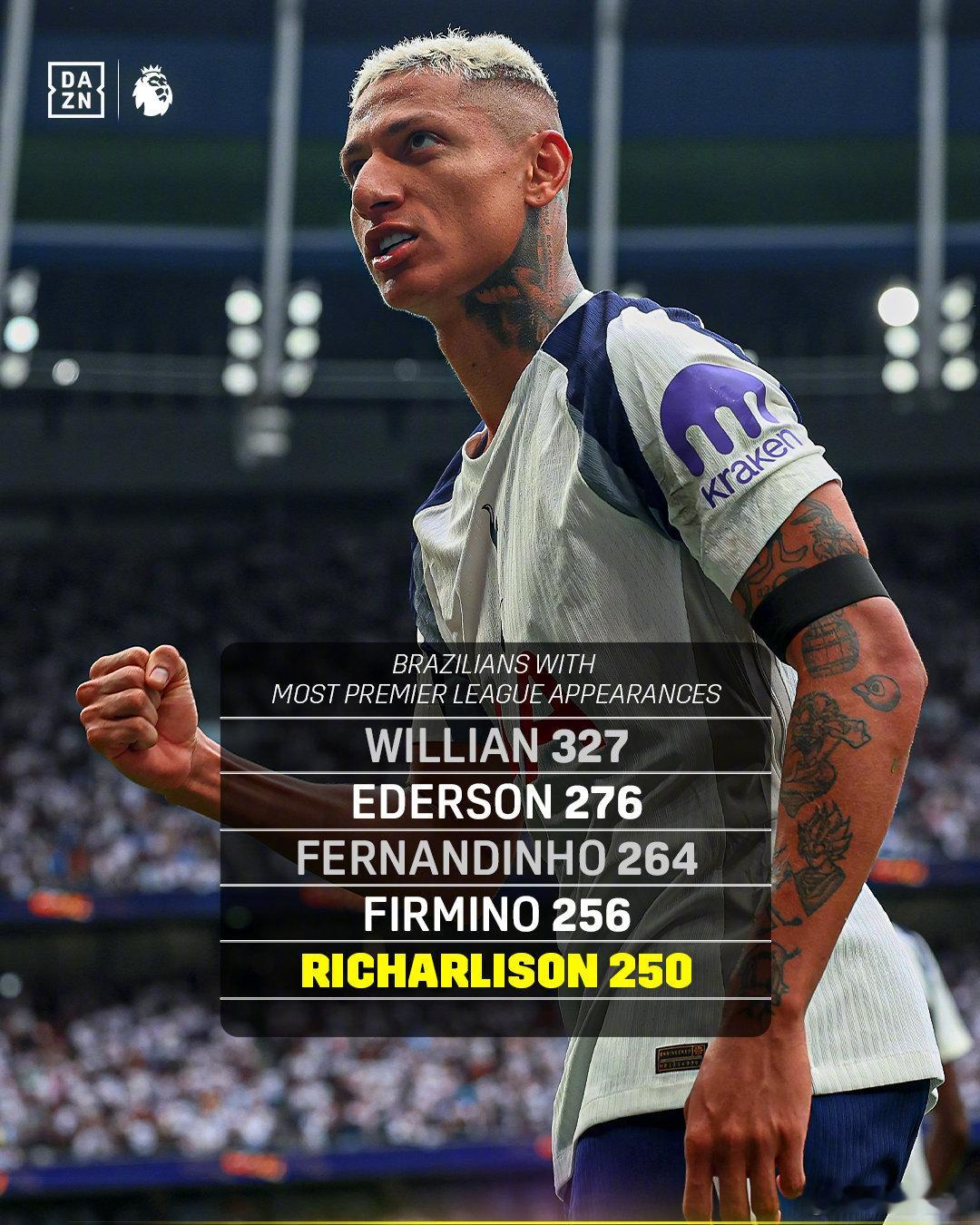 【里程碑】利兹联1比2热刺,理查利森迎来英超250场里程碑,第5位解锁此成就的巴西籍球员,此前4人为威廉,费尔南迪尼奥,埃德森和菲尔米诺。