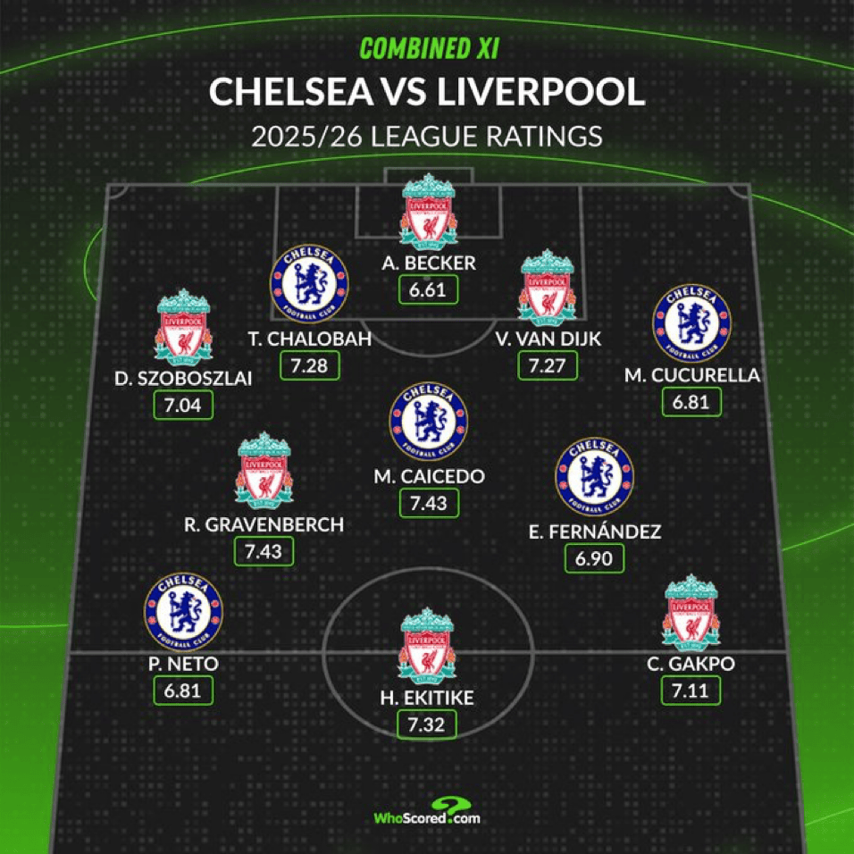 虎扑10月04日讯Whoscored根据球员评分,将切尔西、利物浦两队的球员组成了一套最佳阵容。