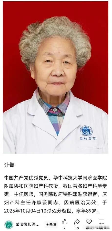 痛心! 妇产科泰斗许家璇同志医治无效逝世 医者不能自医英雄一路走好 今天上午10点52分,我国著名妇产科学专家许家璇教授因病逝世,享年89岁。她是中国共产党优秀党员、国务院政府特殊津贴获得者、我国著名妇产科专家、主任医师、华中科技大学同济医学院附属协和医院妇产科教授,这位从医六十余载的白衣战士,用一生诠释了医者仁心。 许老出生在战乱年代,受父亲影响走上医学道路,立志救死扶伤。身为女同志,更能切身体会妇女的痛苦,因此毅然选择妇产科。刚入职时,协和医院妇产科仅30张床位,她常通宵工作,却不觉得辛苦,每次看到病人从生死线上拉回来,一切辛苦都值得的。 她的人生充满闪耀光环: 首位援非女医生,在马斯卡拉医院,创建首个妇产科,造福当地百姓,参与完善了当地内、外、妇、儿分科医疗体系,传递中非友好情谊。 带领科室攻坚克难,填补多项技术空白,推动产科急危重症救治成功率显著提升,开创高难度外阴癌手术。从无到有,深耕领域带领团队,发展到如今12个病区、300余名医护人员的国内领先团队,拯救了万千妇女。 荣获妇产科最高荣誉“林巧稚杯”,深入基层坚持临床诊疗,十年如一日,为贫困患者解除病痛,高尚医德广为传颂。 斯人已逝,风范长存。许老曾说:这辈子就干了妇产科这一件事。当把一件事情,做到极致,为信仰奉献了一生,非常了不起!致敬这位用生命托举生命的医者!