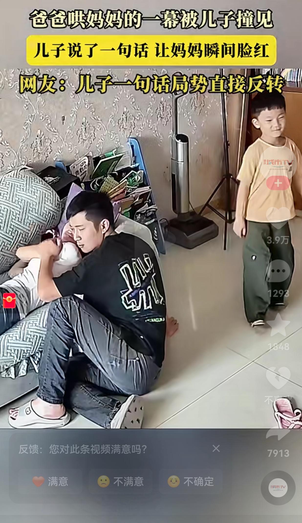 孩子不会说话就别说了!你这样说话,这个家早晚会散的。男子和老婆吵架了,老婆很生气,开始耍小孩子脾气,不愿意搭理男子了。 男子只好厚着脸皮,来到妻子的面前哄她,这一幕正好被儿子看到了。 男子对生气的妻子说:“你原谅我吧!我知道错了!” 妻子还在气头上,直接说了一个滚字。 孩子看到爸爸哄不好妈妈了,就说了一句话,这句话虽是清醒发言,但是,却是神补刀。 只见孩子说:“爸爸,为什么每次你们俩一生气,都是你哄妈妈呢?你看妈妈都对你说滚了,看来妈妈不爱你呀!” 当孩子说了这段话后,妈妈瞬间脸红了!这个时候,妈妈肯定意识到自己忽略了丈夫的感受。 网友看到后评论说,孩子你还是少说点实话吧!你这一句话差点害了一个家庭。 还有的网友说,你看,小孩子都懂的道理,为什么有些女人不明白呢?为什么喜欢作呢?给你一个台阶见好就收,不要由着性子来。万一作狠了,就收不了场了。 要我说,撒娇女人最好命,但是不要太作了!因为,适当的撒娇可以增加夫妻之间的情趣。但是如果一生气,不管谁对数错,就让男人低头认错,时间一长,男人也会疲惫。 对此,你有什么看法呢?欢迎大家评论区讨论留言。