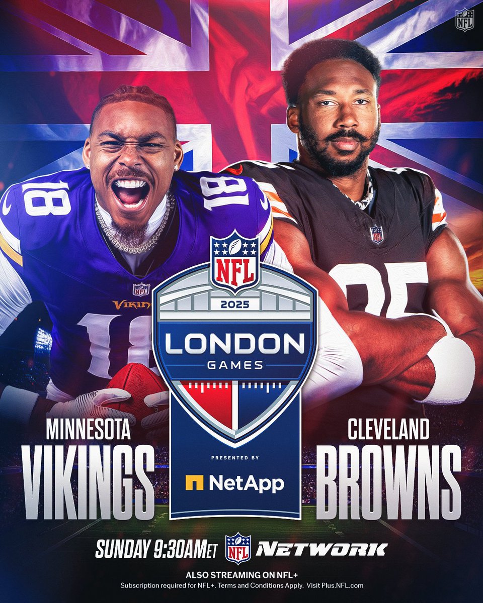 NFL官方X账号发推特报道,本赛季NFL在英国伦敦举行的三场海外赛首战对决正式确定明尼苏达维京人vs克利夫兰布朗——北京时间周日21:30(美国东部时间9:30)通过@nflnetwork直播,@NFLPlus平台同步流媒体播出