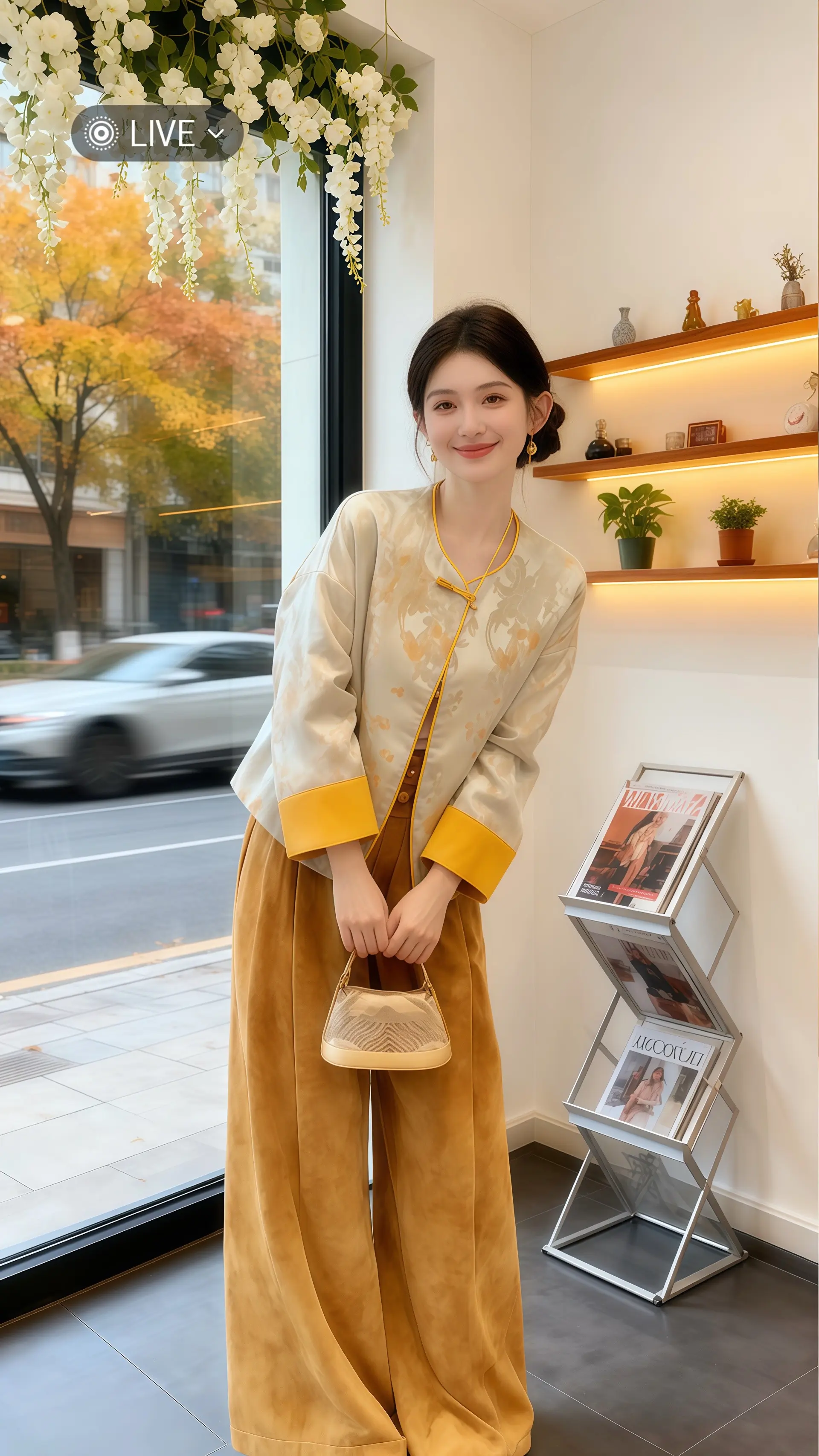 她穿着新中式国风提花两件套,静立窗前,与窗外的秋日风景撞了个满怀。上衣...