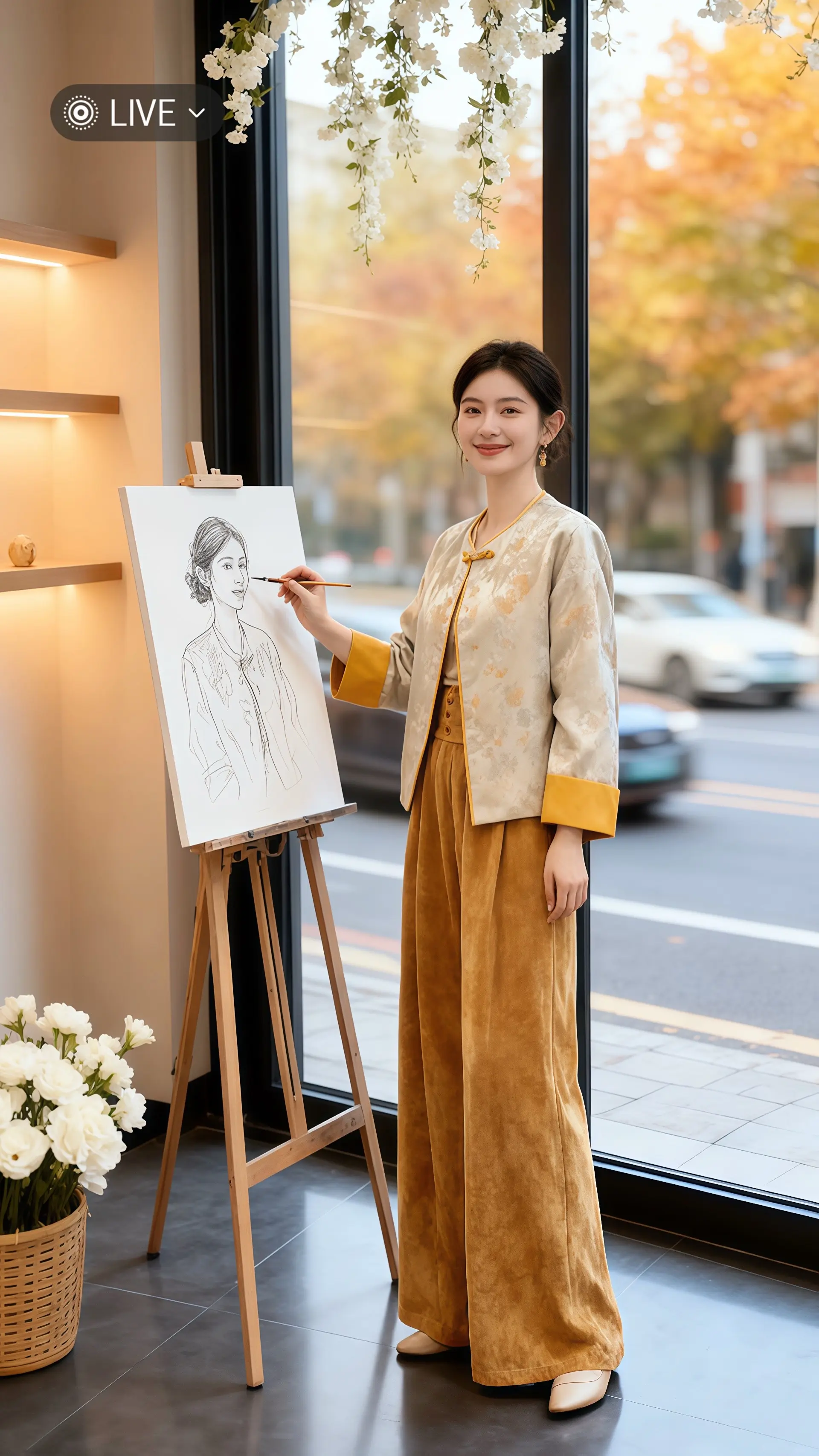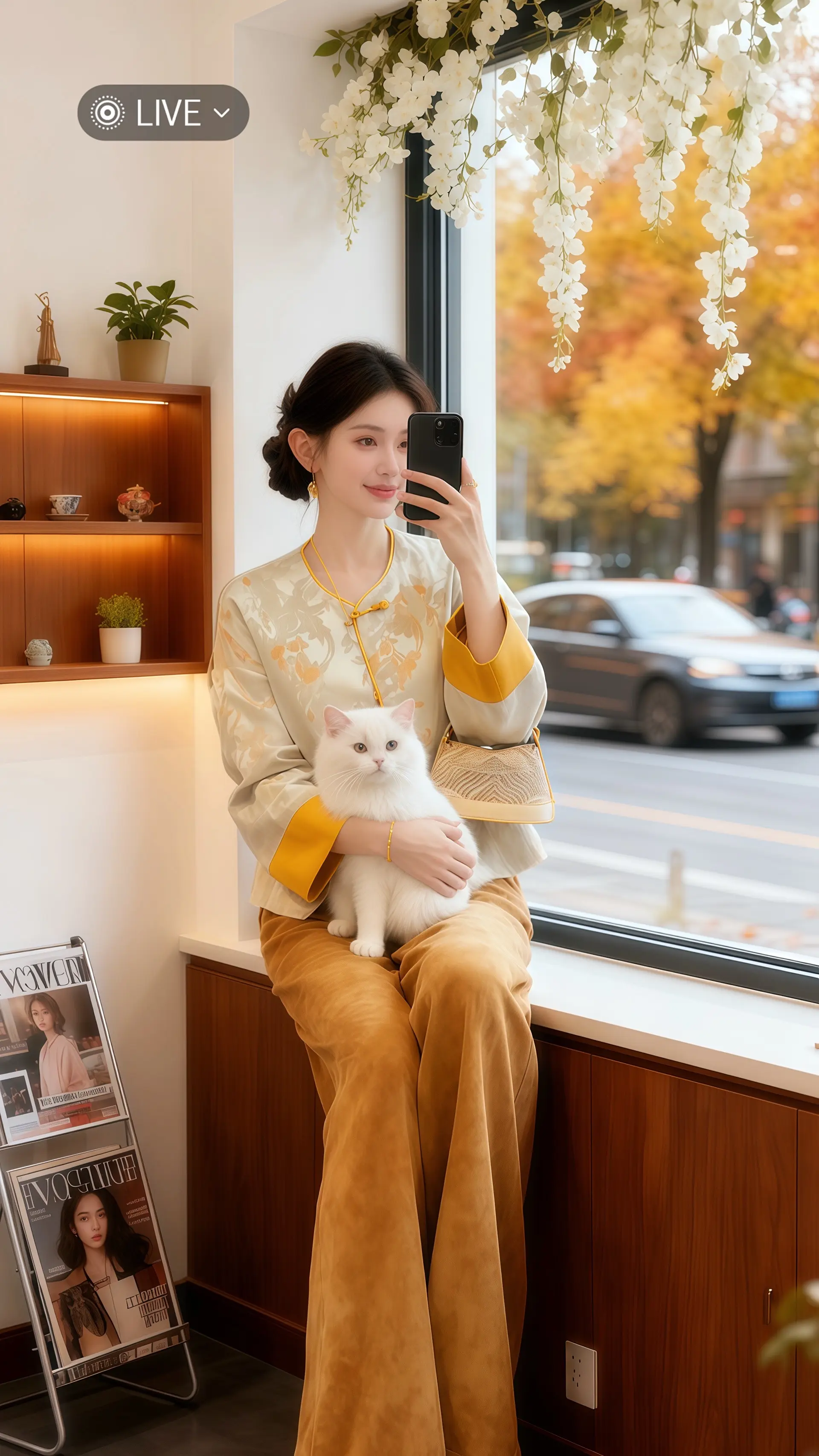 她穿着新中式国风提花两件套,静立窗前,与窗外的秋日风景撞了个满怀。上衣领口的盘扣缀着细碎银线,裙摆处暗纹提花在暖光下若隐若现,将东方古典韵味与现代剪裁巧妙融合。窗外,金黄的银杏叶随风轻摇,斑驳的阳光透过枝叶洒在她身上,与衣料上的花鸟纹样相映成趣。她时而抬手轻拂耳畔碎发,时而凝视着远处渐染秋意的街道,眉眼间尽是温婉恬静。这套两件套的淡雅色调,既衬出了秋日的静谧深邃,也凸显了她身上独特的东方气质,在传统与现代的交织中,勾勒出一幅诗意盎然的秋日画卷。