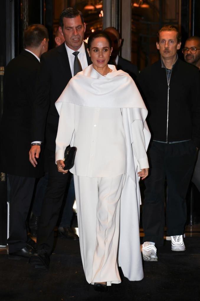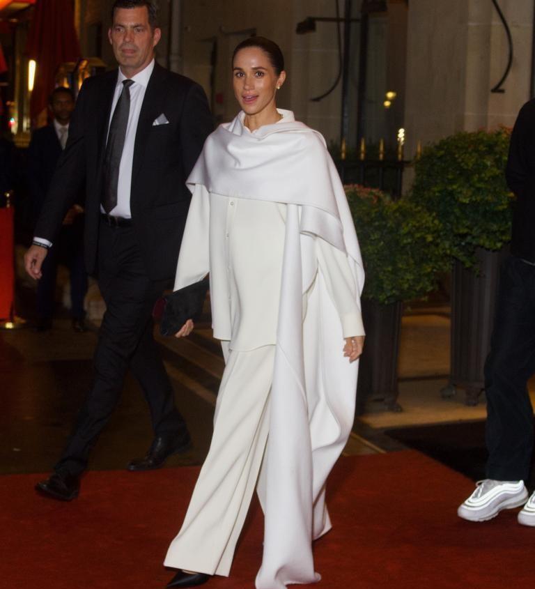 梅根首次参加巴黎时装周,身着全白套装。 44岁的公爵夫人独自访问法国,哈里未露面