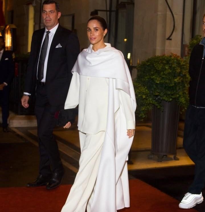 梅根首次参加巴黎时装周,身着全白套装。 44岁的公爵夫人独自访问法国,哈里未露面。 马克尔穿了一件斗篷外套配上直筒裤,妆造美翻。 她被拍到离开酒店前往巴黎世家的秀场,身边有保镖。