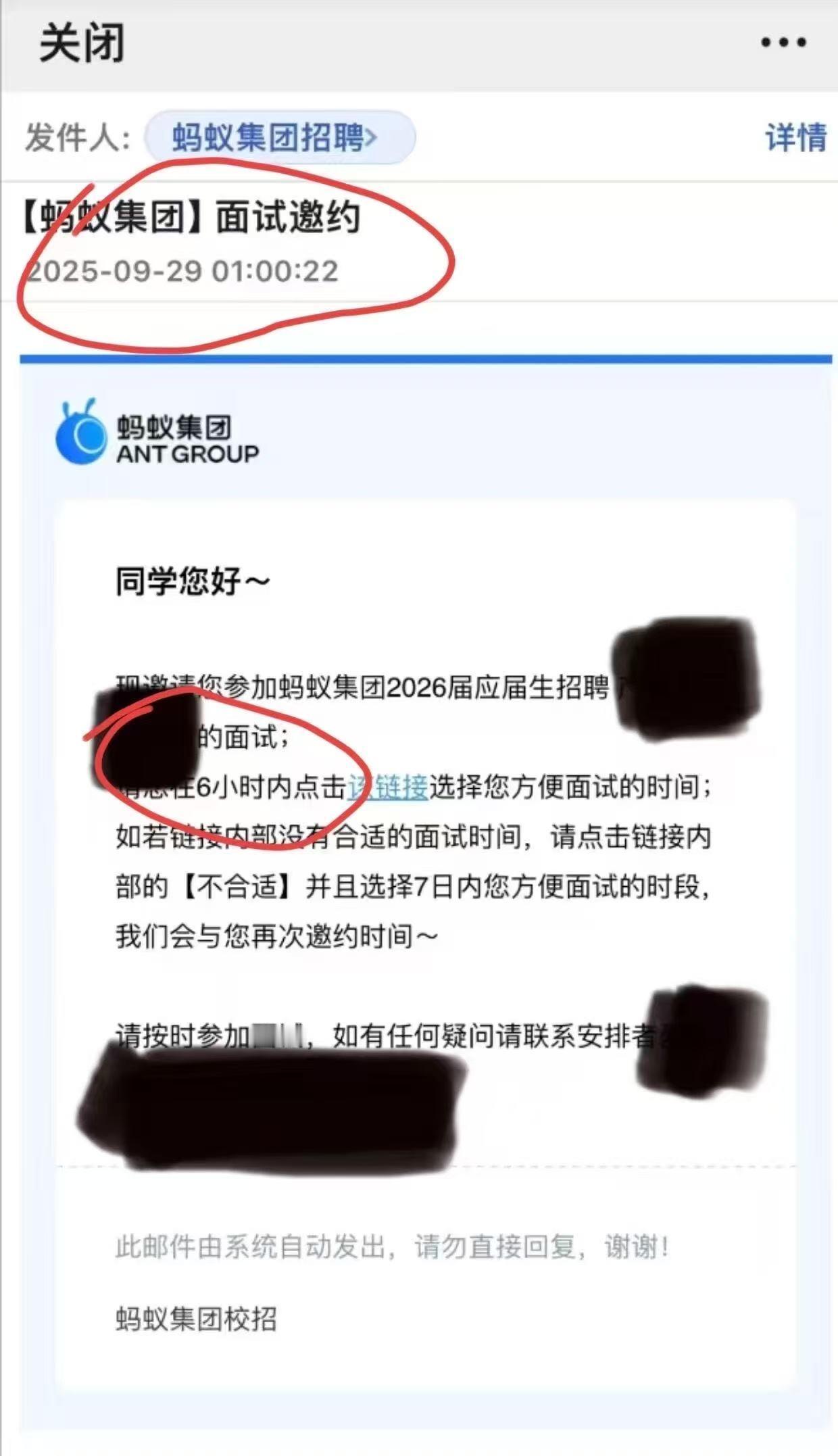 蚂蚁今年校招邮件不是一般的离谱。 有面试者反馈,凌晨1点的时候发出一个要求6小时内必须确认的邮件,逾期就无法正常选择时间。 这是指望他们提前半夜不睡,提前适应工作节奏吗? 只能说蚂蚁有毒。