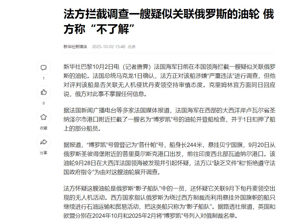 法国这次算是捅了马蜂窝,北约首次扣押俄罗斯油轮,中国北极航线破局。10月1日,法国海军突击队在圣纳泽尔港外海,直接强行登了“博罗凯”号,而这船其实挂着贝宁国旗,装的是75万桶印度订的原油,且全程被媒体拍了个正着。 事后法国政府给出的理由,简直让人哭笑不得,一边说这船是欧盟制裁的“影子舰队”成员,一边又扯它涉嫌参与丹麦上空的无人机袭扰,可明眼人一看就知道这理由站不住脚。 欧盟列的“影子舰队”名单里,光德国企业偷偷卖给俄罗斯的旧船,就有230艘,法国自己之前也没少掺和这种灰色交易,更别说被扣的原油买家是印度,印度压根就没加入对俄制裁,法国这操作跟在国际航道上抢第三方的货没区别。 更要命的是,法国这事儿连国际法都没沾上边。按《联合国海洋法公约》说,只有船旗国才有资格管自己的船,贝宁外交部当天就紧急召见法国大使抗议,直言“这是对国际法的粗暴践踏”。俄罗斯那边也没惯着,第二天就在波罗的海扣了,爱沙尼亚的“绿色钦佩”号油轮,第三天直接派核潜艇去北海搞反潜演习。 最狠的是俄罗斯经济部直接列了份,西方在俄3120亿美元资产的清单,放话“谁动俄资产,俄就动谁的在俄资产,额度一比一实时算”,这一下就把法国逼到了两难境地。要是拿不出实锤证据,不仅得放船赔钱,还得丢了国际信誉。 其实法国这么干,说到底是国内政治出了问题。马克龙支持率都跌破30%了,想靠“硬刚俄罗斯”转移民众对高通胀的不满,可他显然没算到俄罗斯的反制这么快、这么狠。早在2025年7月,俄海军就开始在英吉利海峡给油轮常态化护航,芬兰湾更是直接启动武装护航机制,之前爱沙尼亚想拦俄油轮,苏-35S战机直接用雷达锁定了北约的舰机,逼得对方只能撤退,现在法国主动挑事,简直是往火药桶上凑。 可就在法国扣船把全球航运,搅得鸡犬不宁的时候,中国这边却传来了好消息。“伊斯坦布尔桥”轮从宁波舟山港启航,开了条18天直达英国的北极新航线。这条航线比传统苏伊士运河航线短了22天,单箱运输成本降了28%,思格新能源公司出口欧洲的储能设备走这条线,不仅成本少了40%,还能刚好赶上圣诞季的备货高峰。 更重要的是,北极航线避开了马六甲海峡、亚丁湾这些容易出事儿的地方,海盗袭击风险直接降了90%以上,宁波舟山港也借着这条线,成了全球唯一能连四大洋的港口枢纽,世界航运的格局这下算是被改写了。 而且,中俄在北极的合作,早就不只是做生意那么简单了。两国专门成立了北极航道合作分委会,2024年就开通了集装箱班轮北极航线,跑了20个往返;“北极快线1号”光一年就运了2万多标准箱,俄罗斯的木材、纸浆这些资源,顺着“冰上丝路”不断往中国运。最有象征意义的是,中国的“雪龙2号”破冰船已经能在北极夏季独立通航了,可美国至今只有2艘老旧的破冰船,在北极这块儿明显跟不上趟儿。 另外,法国这一扣船,也把北约内部的裂痕彻底露了出来。比利时直接反对动那笔冻结的1400亿欧元俄资产,因为90%的钱都存在布鲁塞尔清算中心,一旦违约,比利时的国家信用就得栽进去;德国经济部的官员私下也承认,欧盟对俄制裁让欧洲天然气价格涨了400%,德国工业的产能利用率都降到65%了。 更讽刺的是,法国扣的“博罗凯”号,实际控制权在一家开曼群岛的公司手里,西方那套制裁根本查不到真正的利益链,说白了就是雷声大雨点小。 还有就是,中国北极航线一开通,西方对航运通道的垄断算是彻底破了。高盛预测,到2030年北极航道的货运量能突破3000万标准箱,占全球贸易量的6%,这意味着苏伊士运河每年得少赚1200亿美元通行费,欧洲港口的中转优势也得被北极航线抢走不少。更关键的是,中国通过北极航线直接连北欧,不用再走美国能控制的马六甲海峡和南海,战略安全系数一下子提上去了。 最有意思的是,法国在大西洋扣俄油轮的时候,俄罗斯的“影子舰队”正借着北极航线往亚洲运石油。那些挂着方便旗、关了应答器的油轮,在北极冰层的掩护下根本不好找。国际能源署的数据显示,2025年上半年俄罗斯通过北极航线出口的石油涨了230%,西方制裁造成的损失全被这补回来了。 说到底,法国扣船这事儿,就是西方霸权主义在那儿垂死挣扎。他们还想着用“法律”当幌子维持旧秩序,却没看清游戏规则早就被新兴力量改了。 事实上,这场博弈到最后,输的肯定不是俄罗斯,而是那些沉迷“规则霸权”的西方国家。北约那根制裁大棒,终究抵不过市场规律和技术变革。以后的世界,再也不是几个国家说了算,而是那些真能拥抱全球化、尊重市场的国家才能主导——这大概就是法国扣船事件最该让人明白的道理。 参考资料:新华社
