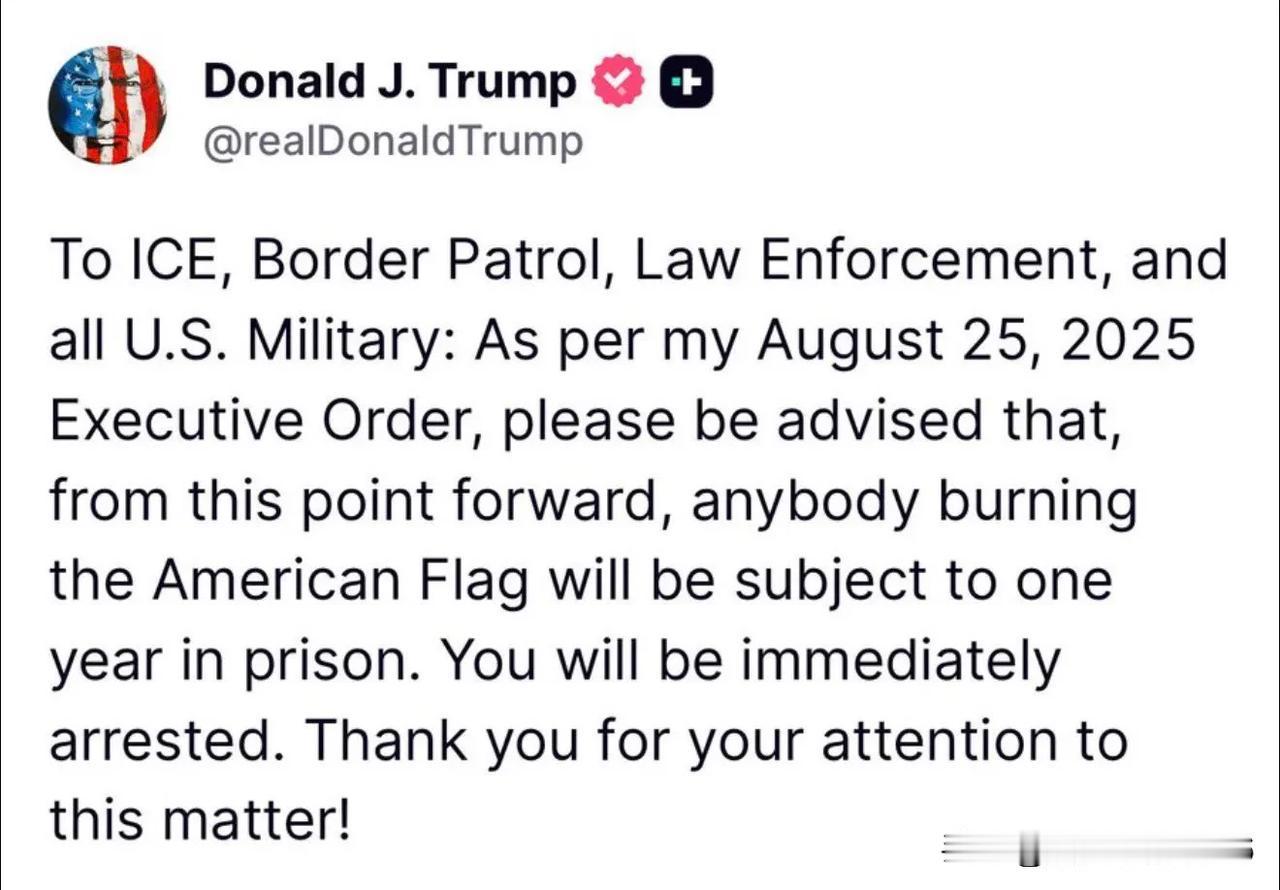 川普口含天宪,宣布立即抓捕任何烧美国国旗的人判刑一年,虽然最高法院早就判决过烧国旗是受宪法保护的言论自由。