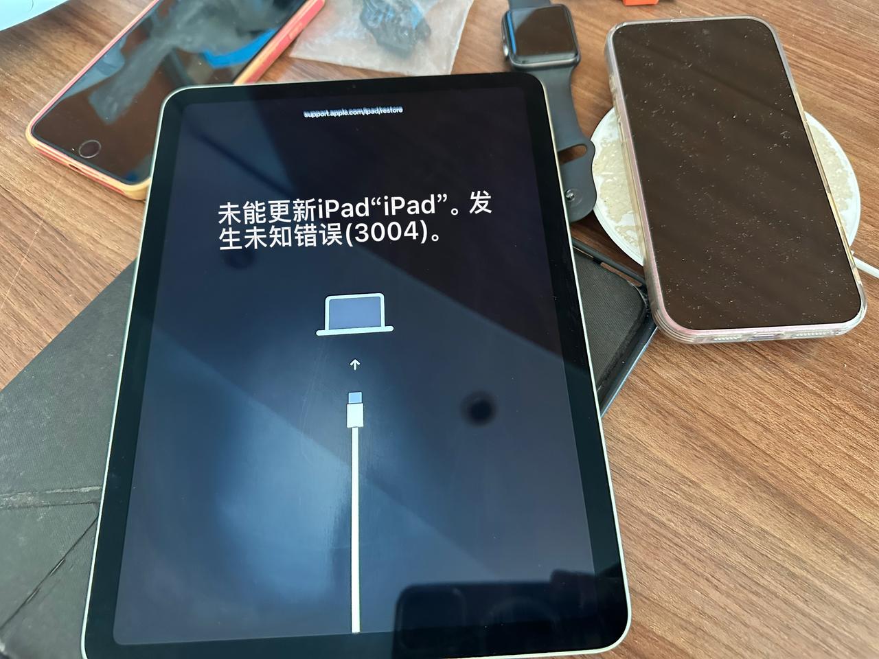 (1412):孩子,早上好。早上六点起床后不久,弟弟就过来说“iPad打不开机”,一看,屏幕上显示一根线缆和一台电脑,接着不管怎么启动,都是原样。连上mac电脑,更新不行,恢复也不行,不知道是否还有解决的办法。mac屏幕显示代码:未能更新iPad“iPad”。 发生未知错误(3004)。