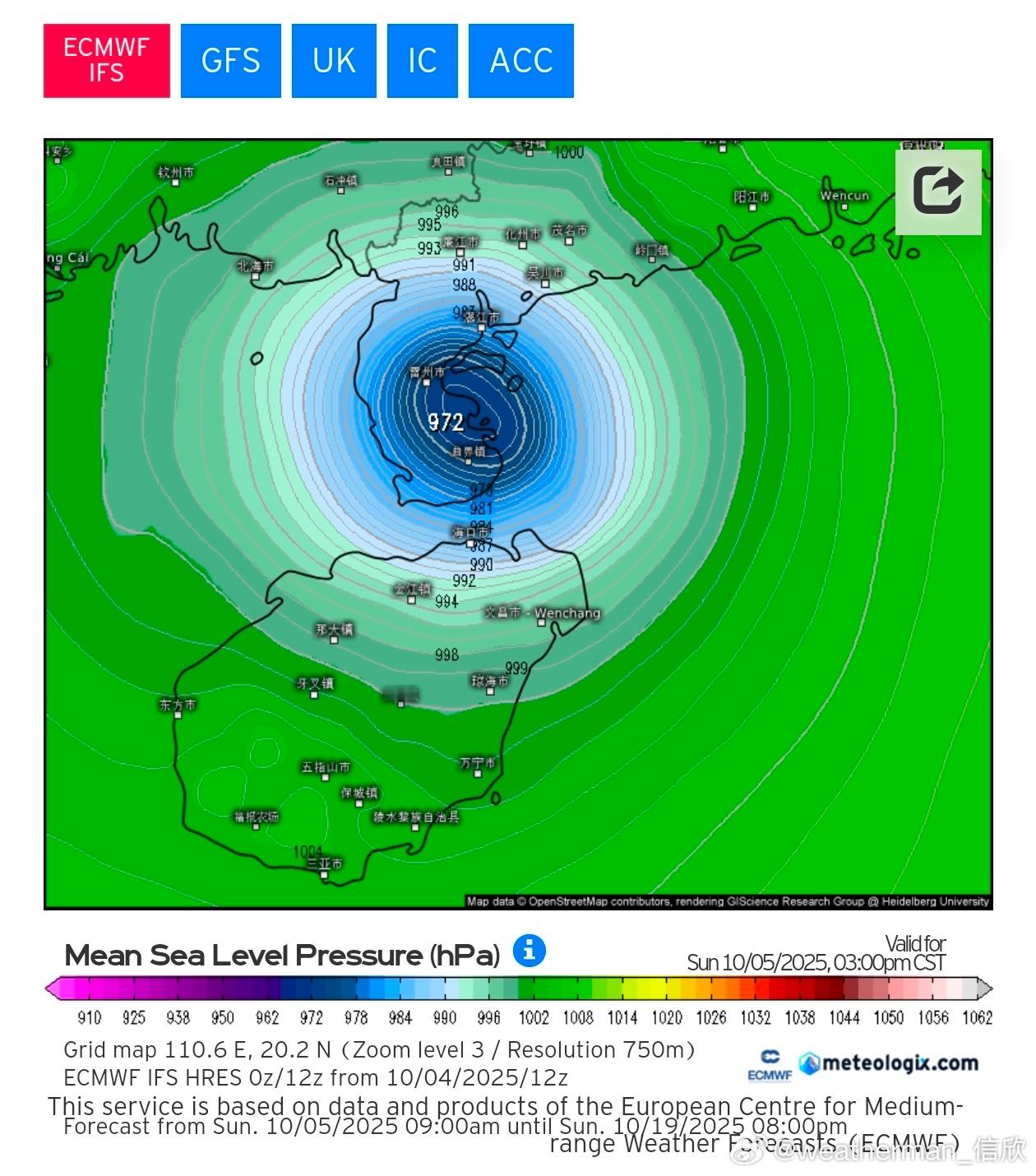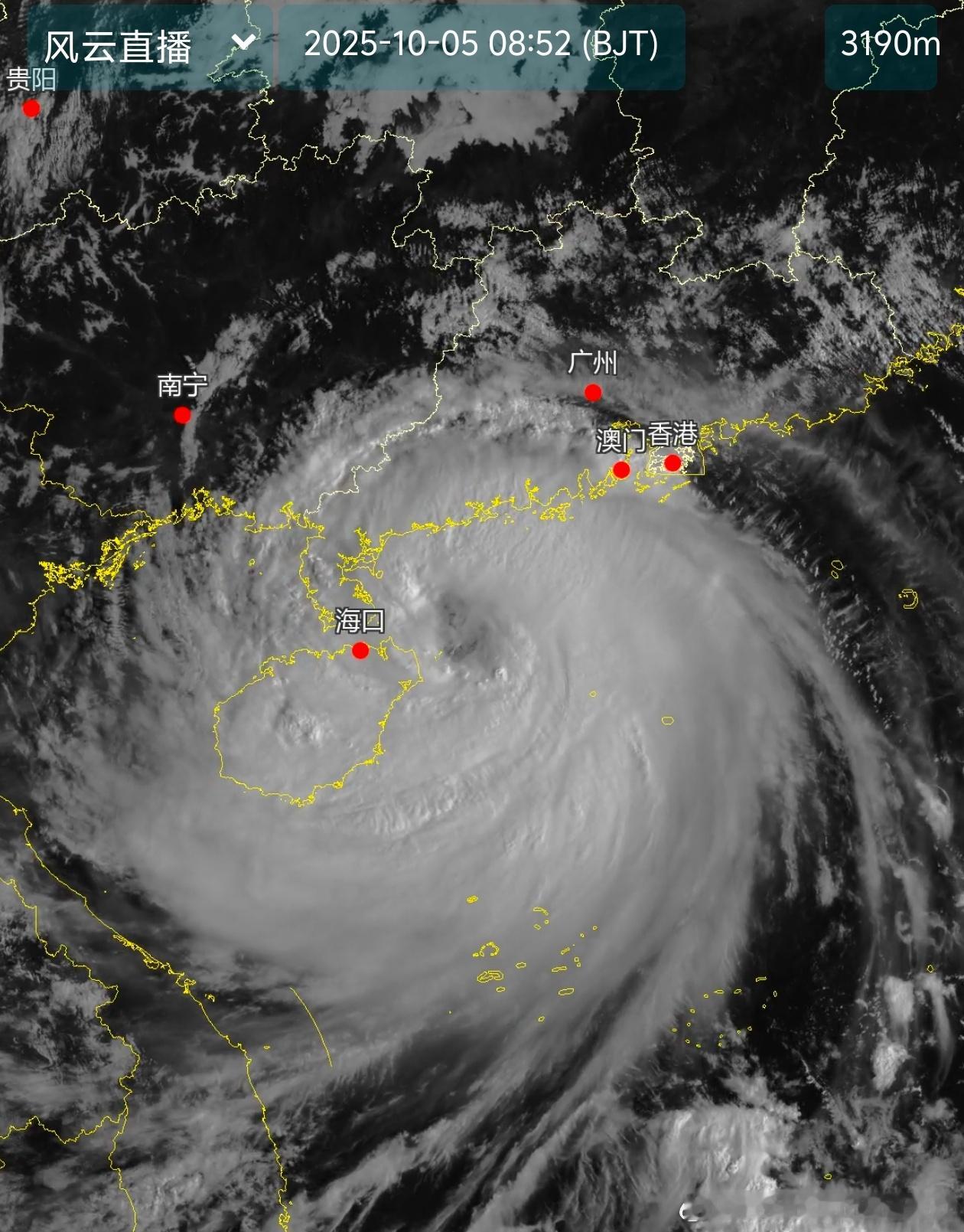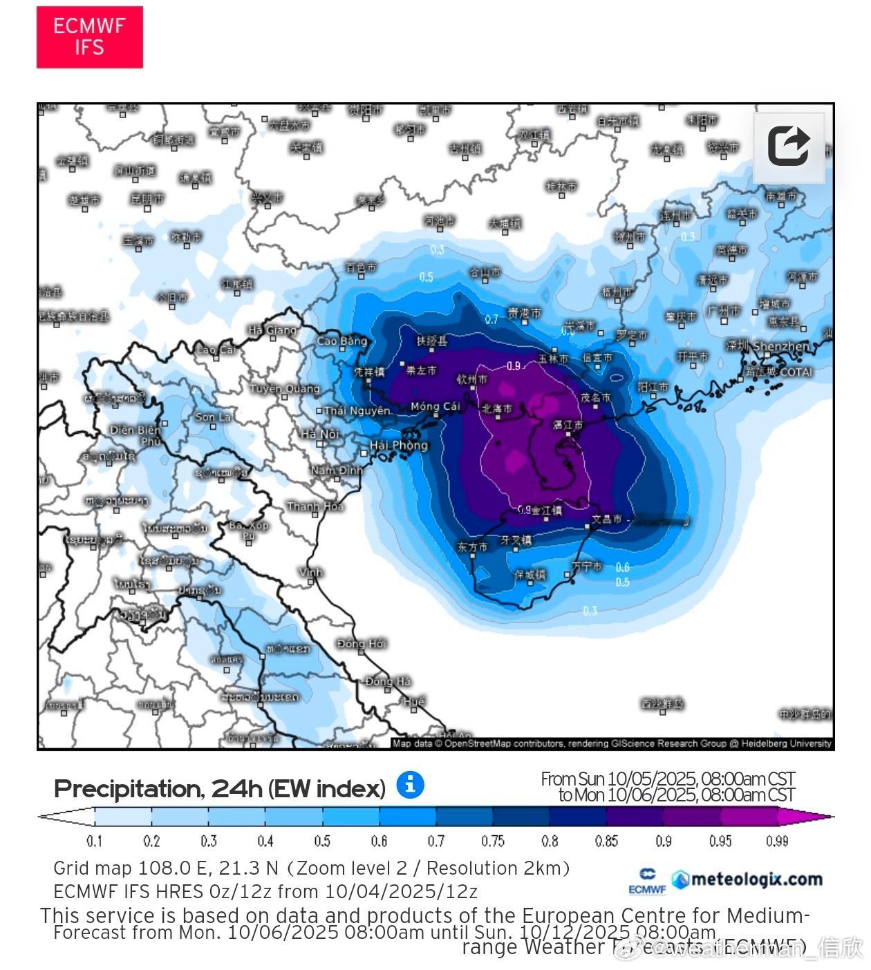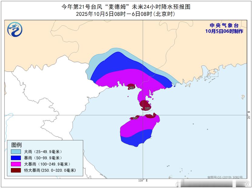 降水预报:10月5日08时至6日08时,海南岛大部、广东西南部、广西南部等地部分地区有暴雨到大暴雨,局地特大暴雨(250-320毫米)。