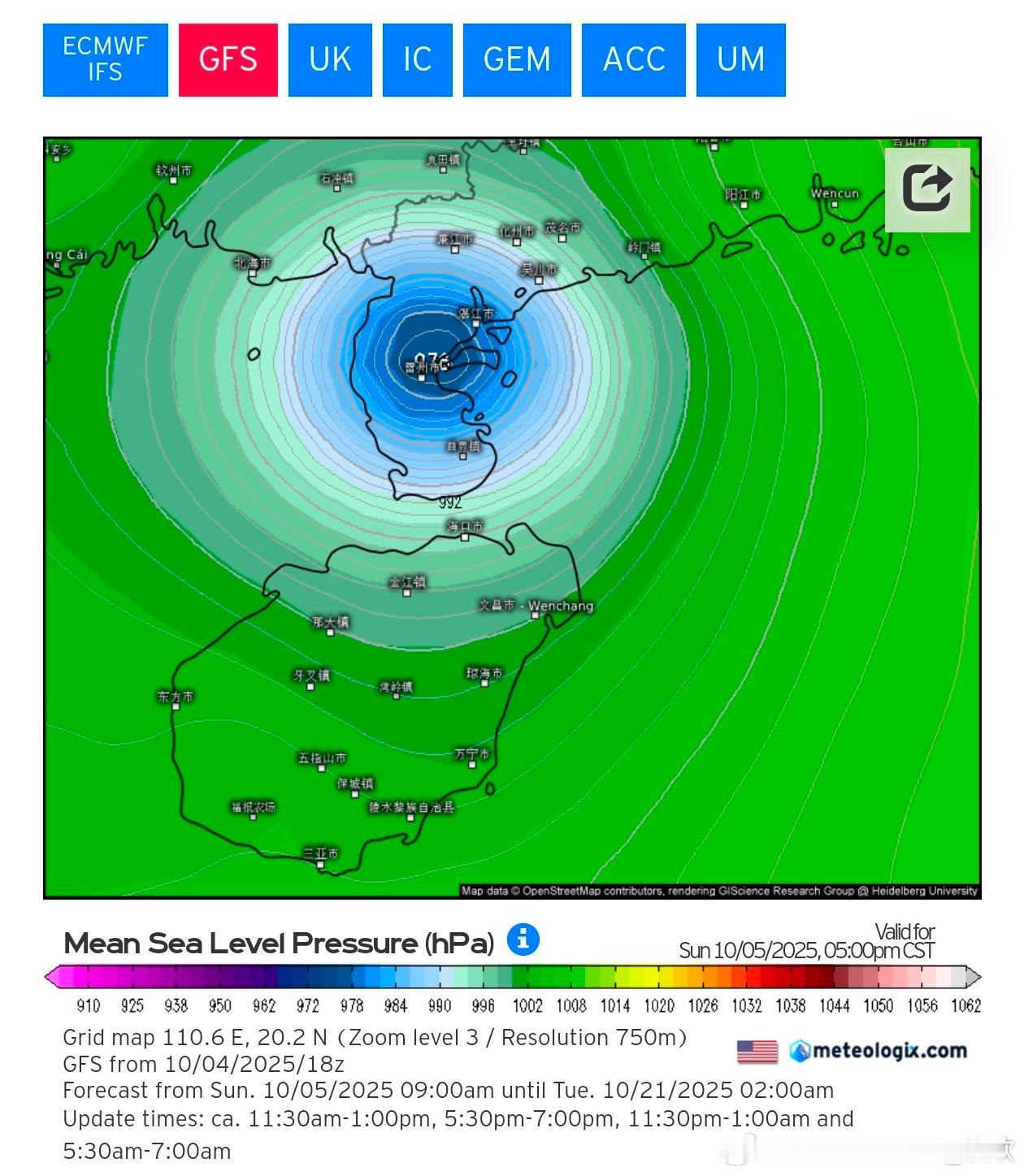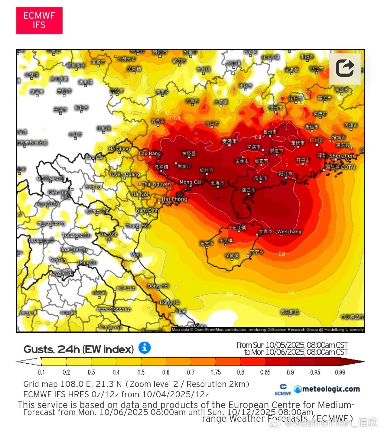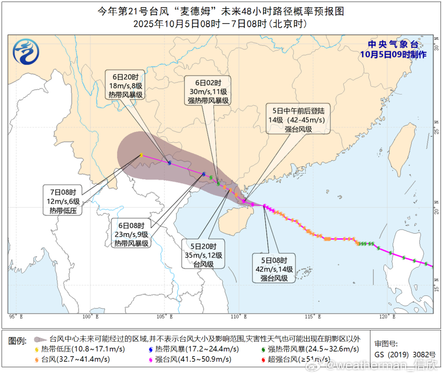 降水预报:10月5日08时至6日08时,海南岛大部、广东西南部、广西南部等地部分地区有暴雨到大暴雨,局地特大暴雨(250-320毫米)。