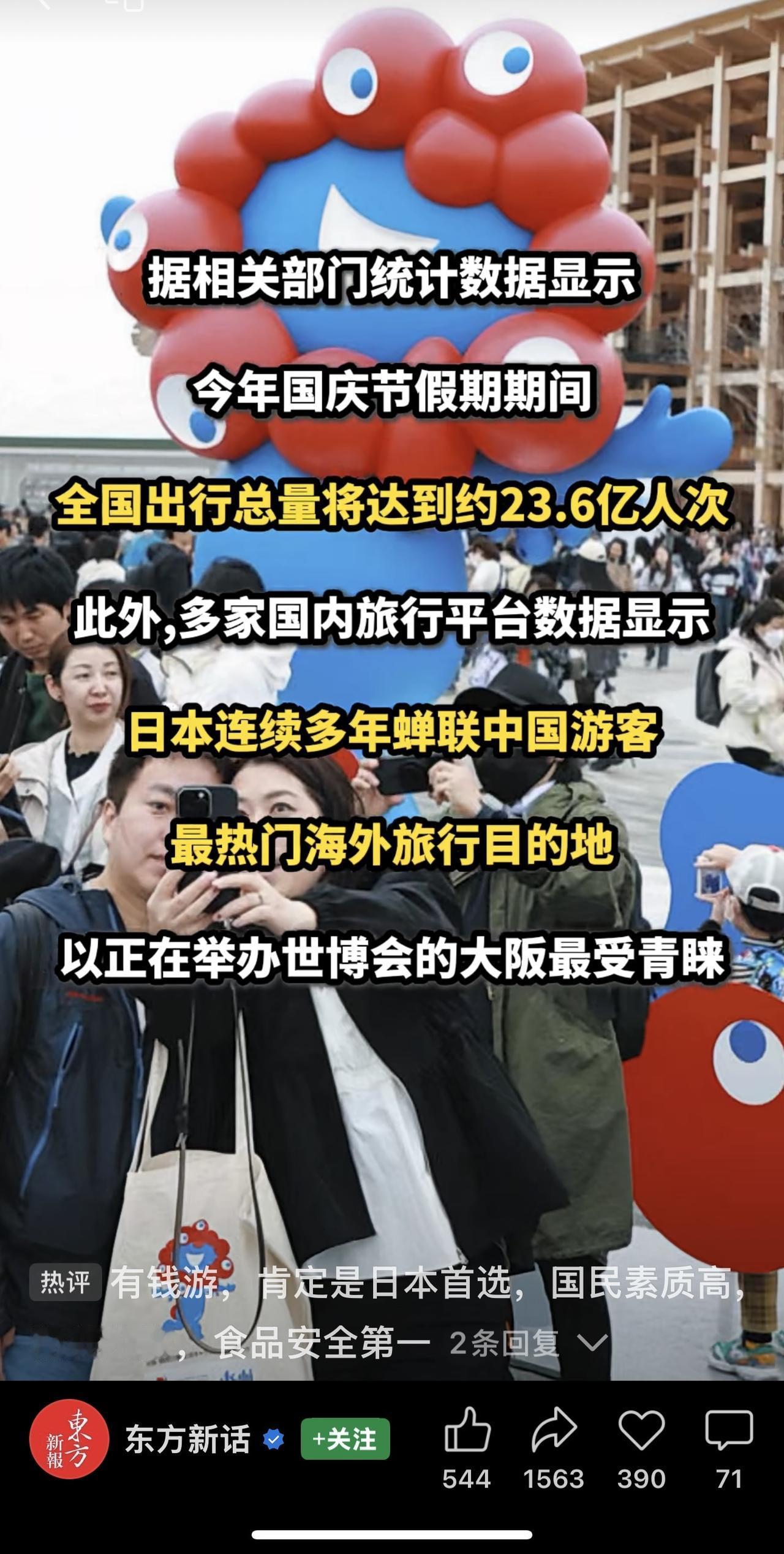 日本位居国庆出境游目的地榜首,大阪和东京为最热门城市 热门城市 东京、北海道、