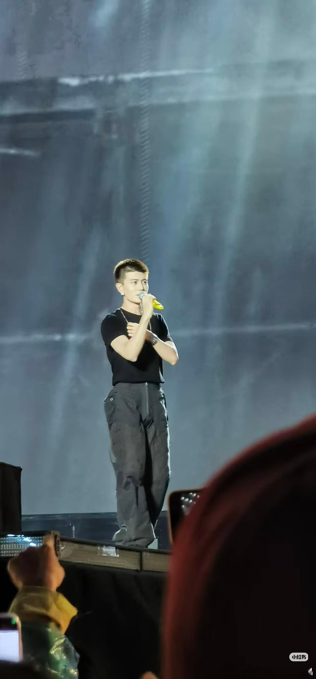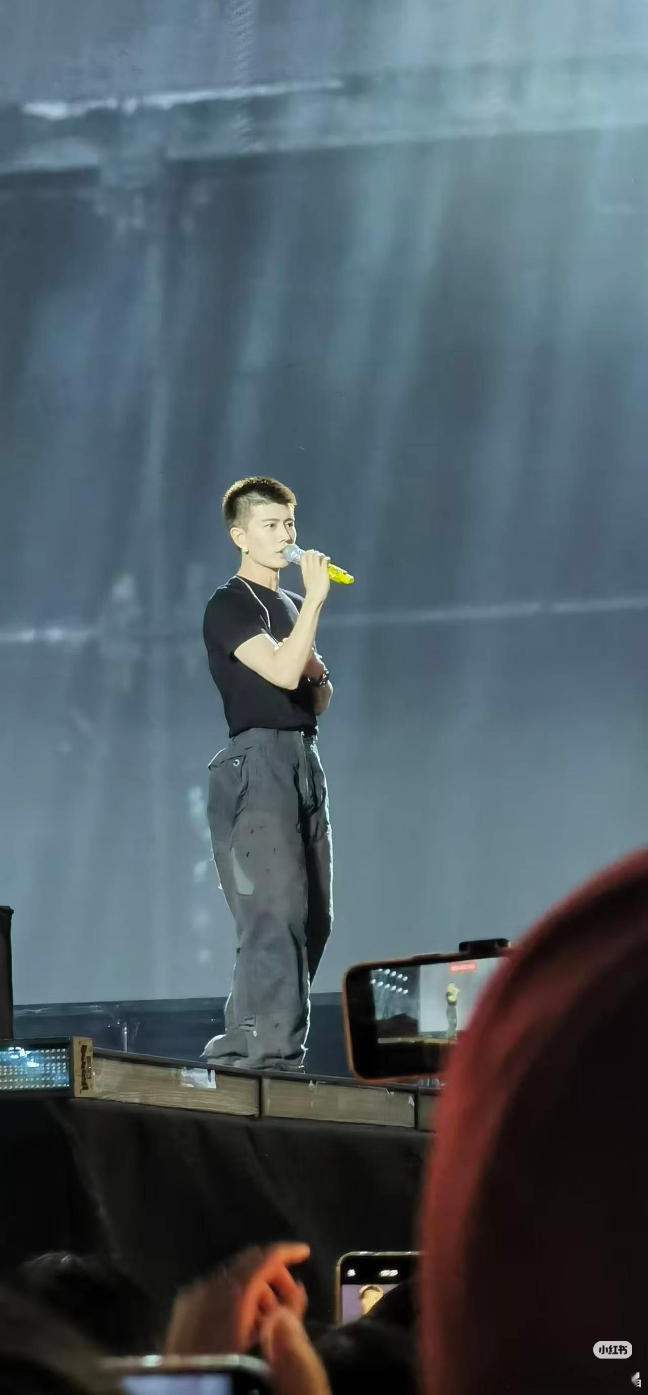 任嘉伦宝鸡音乐节造型寸头、黑色短袖、灰色工装裤,真的好像警校生在舞台上唱歌!有网
