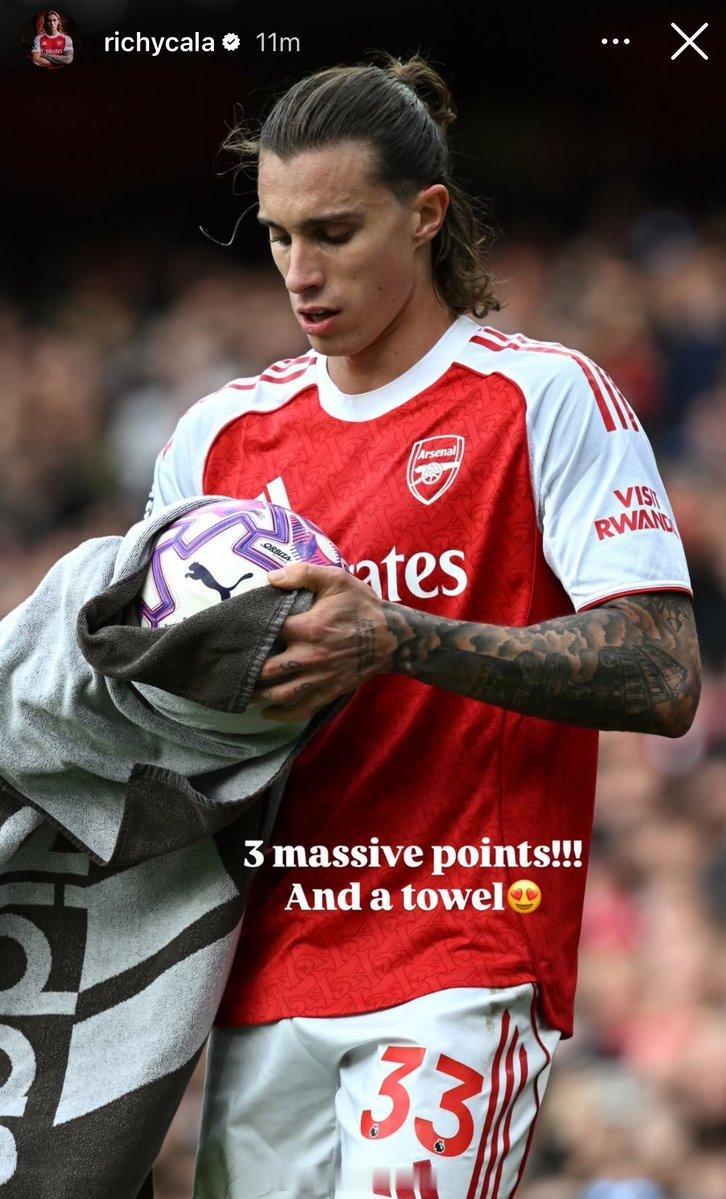 卡拉菲奥里更新社媒调侃:“3分!!!还有一条毛巾😍”🤣❤️ 阿森纳2比0西汉姆联 金秋观赛季 中秋元气担当
