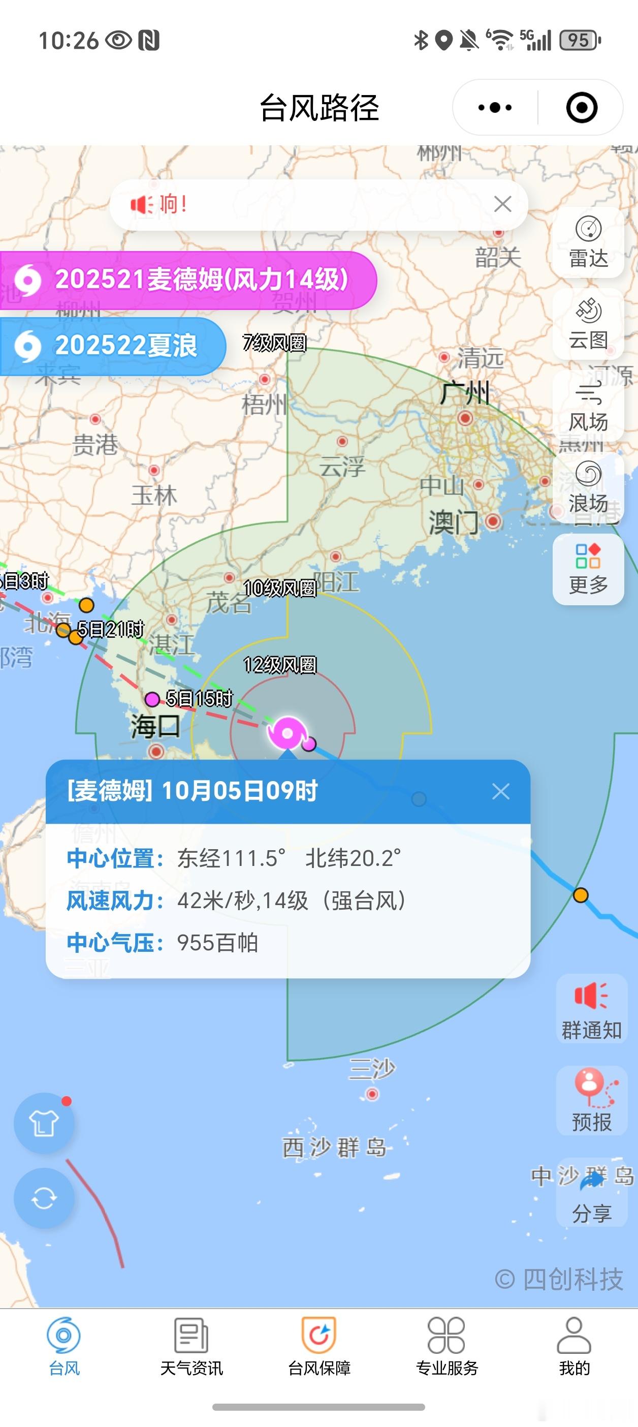 好家伙,麦德姆中心风力已经到14级了,覆盖广深区域直奔海口湛江,刚才小区管理处打