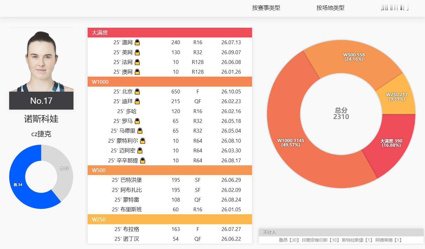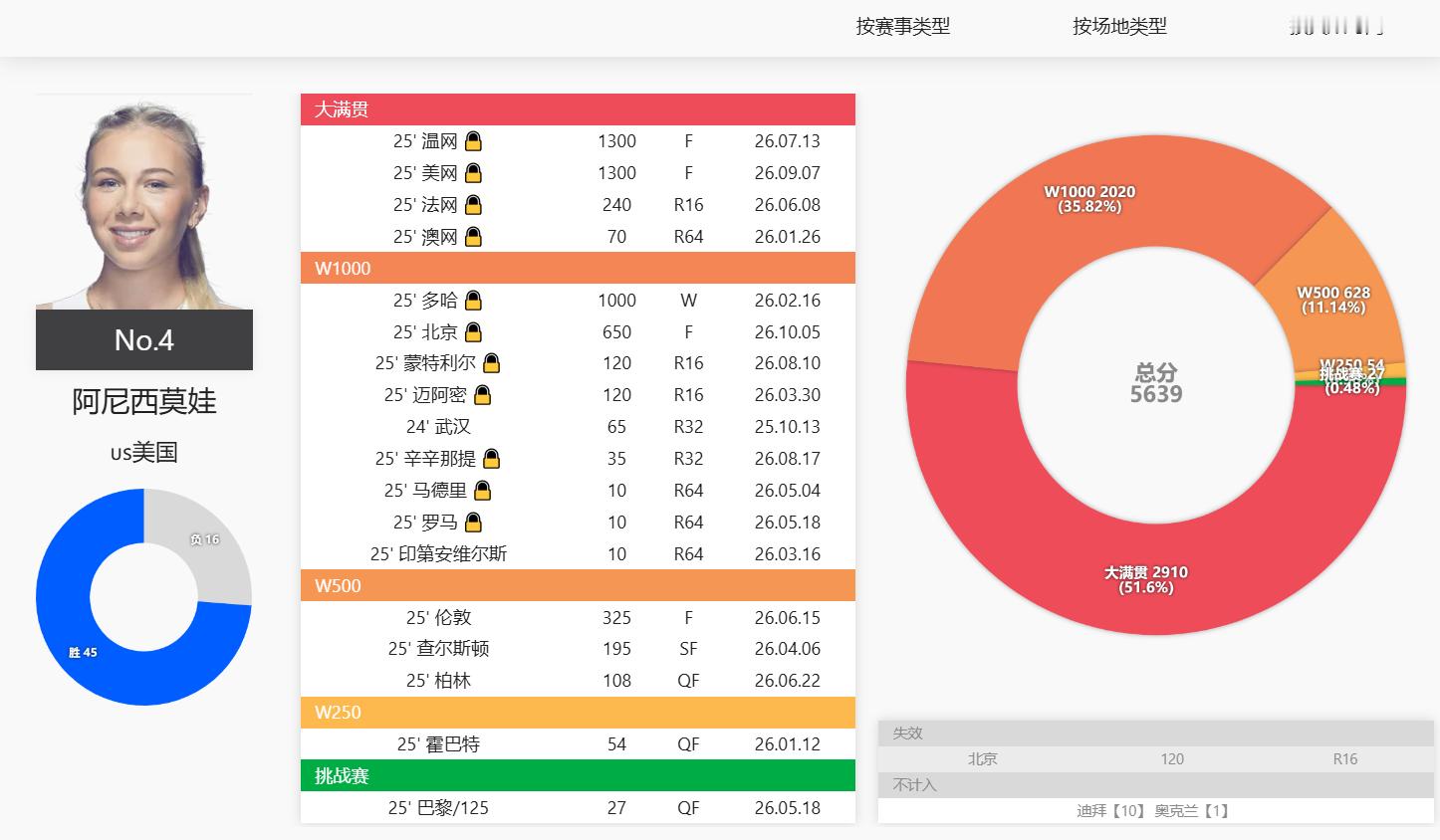 看积分组成蛮有意思的,诺斯科娃的1000赛积分占了一半,第二占比高的是500赛。而阿尼西莫娃的大满贯积分就占了一半,和1000赛加起来占总积分的87%!今年可谓是大赛女王了!