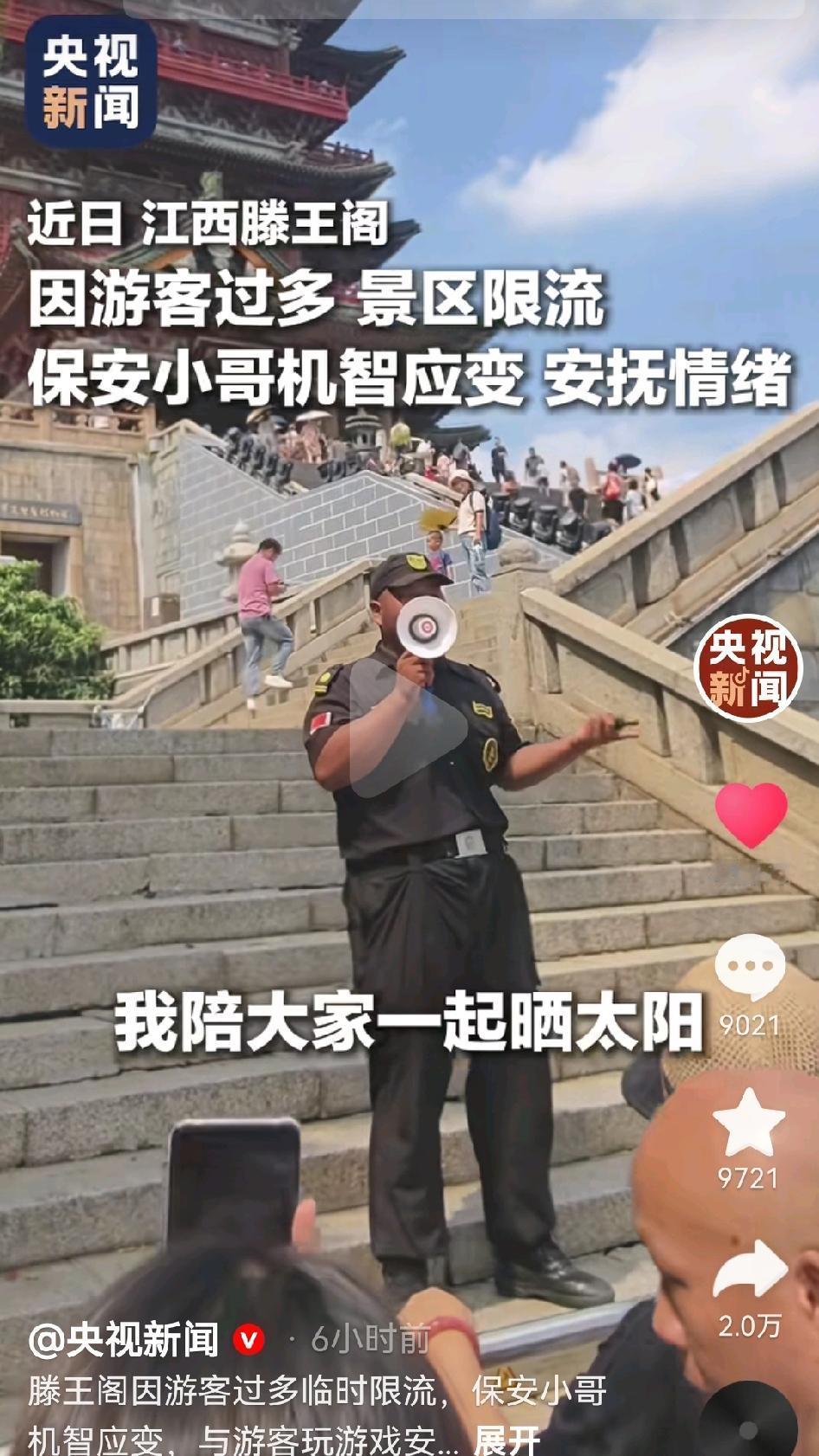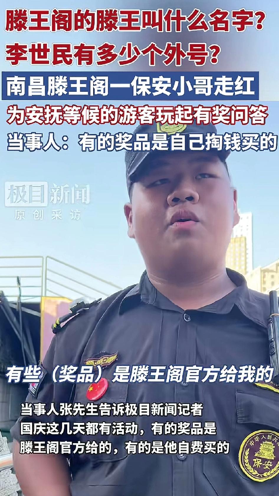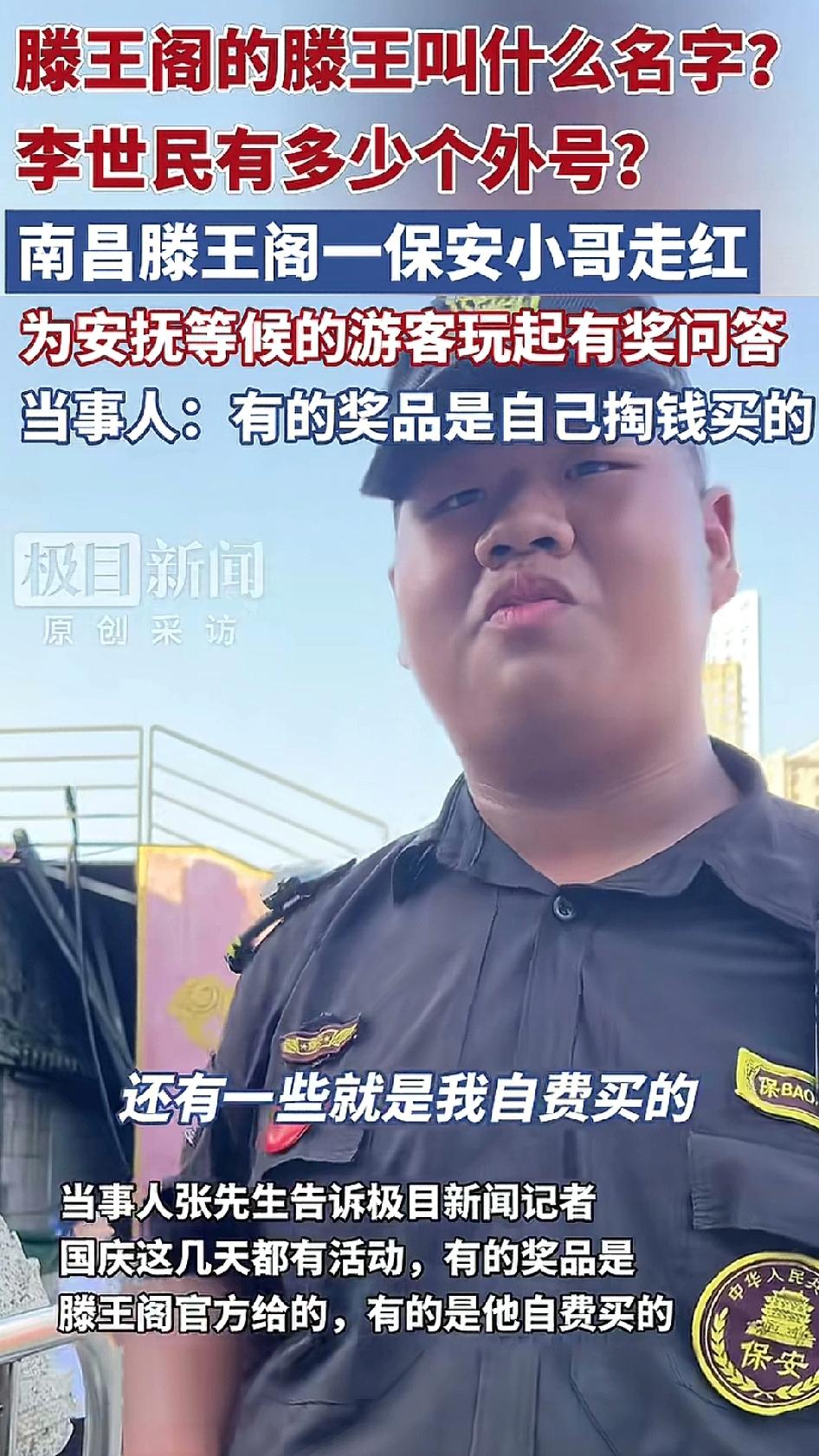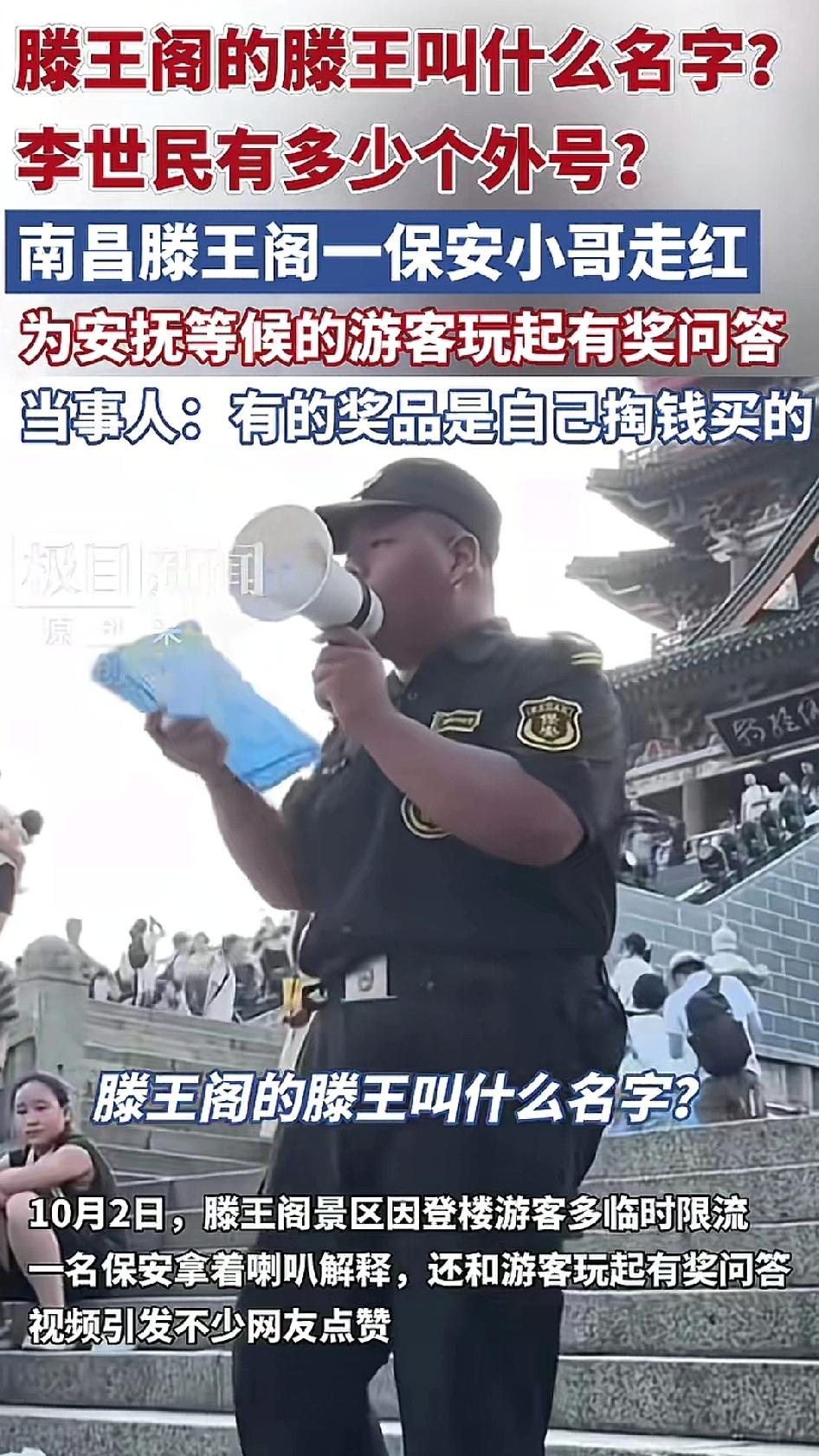 这个保安小哥应该重重的奖励,甚至可以考虑把它纳入编制!!国庆假期,江西滕王阁景区人挤人,人流量已经超过了滕王阁可容纳限度,于是实现限流,一大批游客被挡在滕王阁下,怨声载道。这时候,负责限流的保安小哥勇敢的站出来了。他对游客们说,“我知道大家都在晒太阳,这是我们工作的失误,但是上面已经人挤人了,我陪大家一起晒太阳,我也不躲在阴凉处,我知道大家等的很无聊,这样我们来玩一个小游戏,有奖问答。”保安小哥就这样和游客们开始了一问一答的互动,我问你答,答对了,给一瓶水……水用完了,还给了其他的奖励,这些奖励有的是滕王阁景区给的,有的是保安小哥自费买的。 游客在景区长时间等待是常有的事,但是,能够像小哥这样把无聊的等待化为有趣的游戏,可以说是非常值得推广的一种方式。 游客被限流,被堵成一圈,就是景区的责任,与保安小哥毫无关系。保安小哥完全可以就那么拦着,然后看着游客在下面吐槽和受罪。但是他没有,保安小哥有高度的责任心,没有高度的同理心和同情心,所以,他看不了游客吐槽景区,更看不了游客在那里受罪, 依我看,区应该给保安小哥至少5000块的奖励,最好能够给保安小哥一个编制。理由很简单:滕王阁景区不缺保安,但是缺一个能够替景区考虑、替游客考虑的安保队长!!