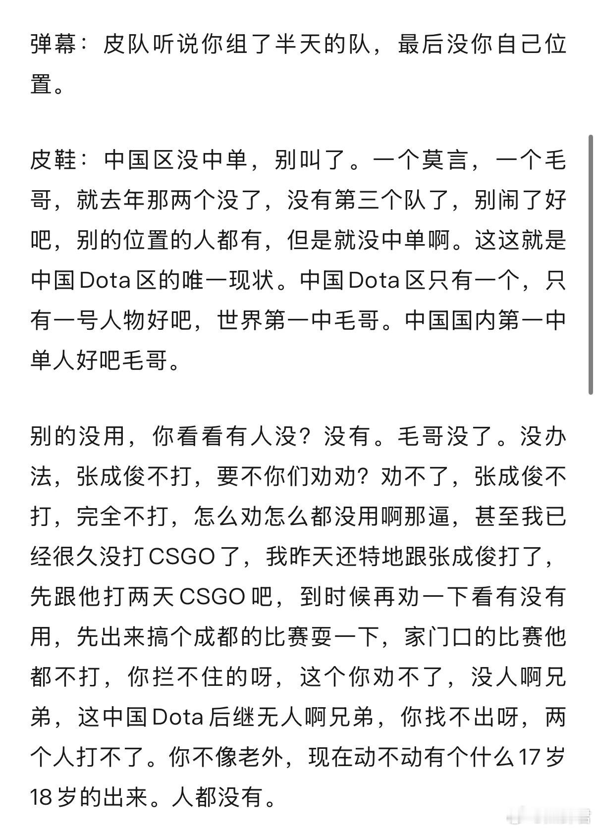 皮鞋说组队实在没中单,为了叫张成俊出山特地陪他打了两天CS,然后俊宝还是没答应[允悲]dota2