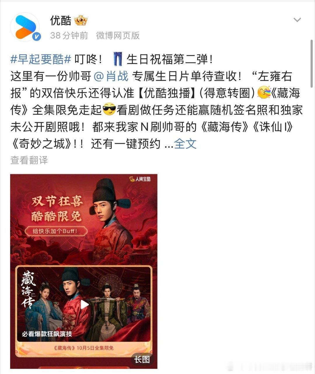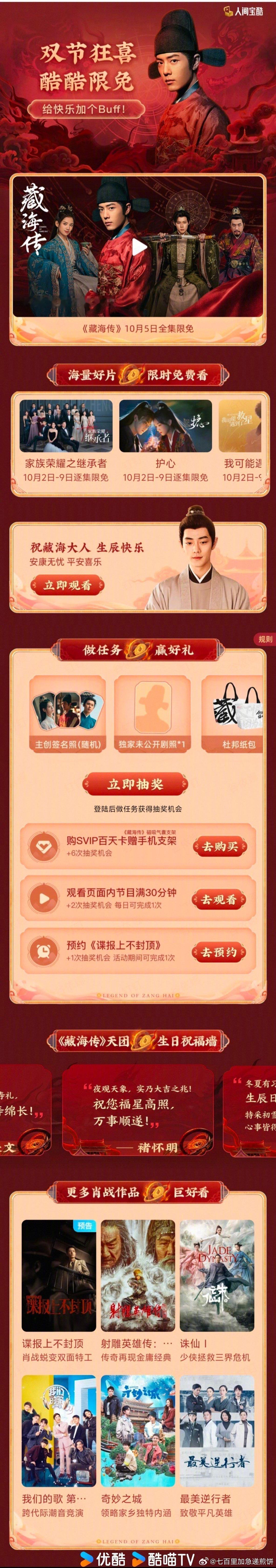 肖战生日 鹅和酷第一时间送上祝福,尤其是这个酷,要把今天变成肖战日了,站内给藏海传搞了“藏海限免”专栏和各种生日快乐弹窗 太宠了吧