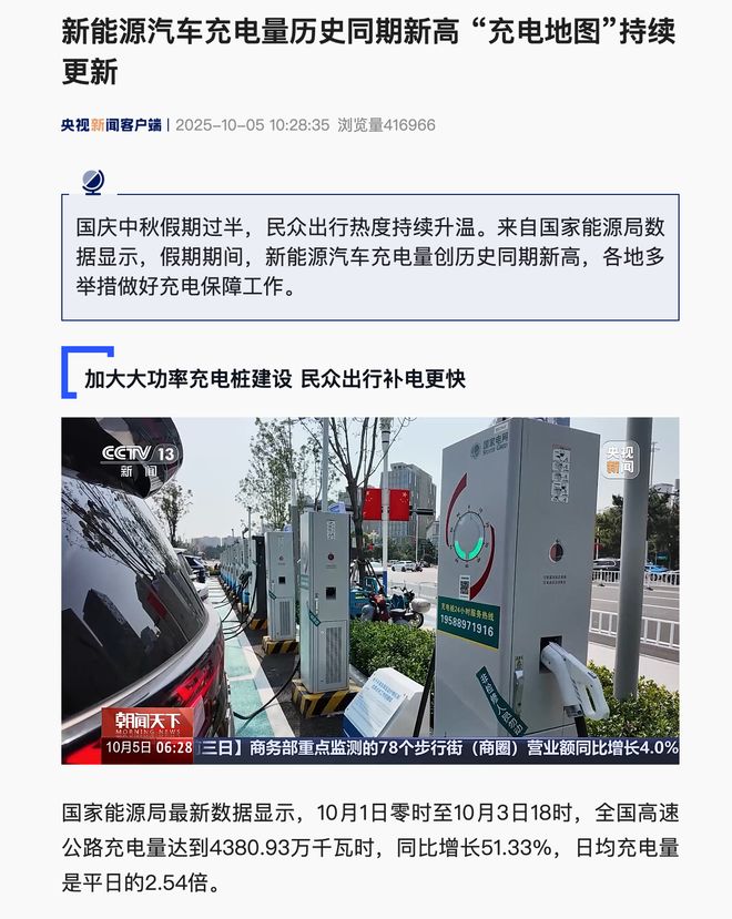 IT之家10月5日消息,据央视新闻援引国家能源局数据,2025国庆中秋假期期间,新能源汽车充电量创历史同期新高,各地多举措做好充电保障工作。