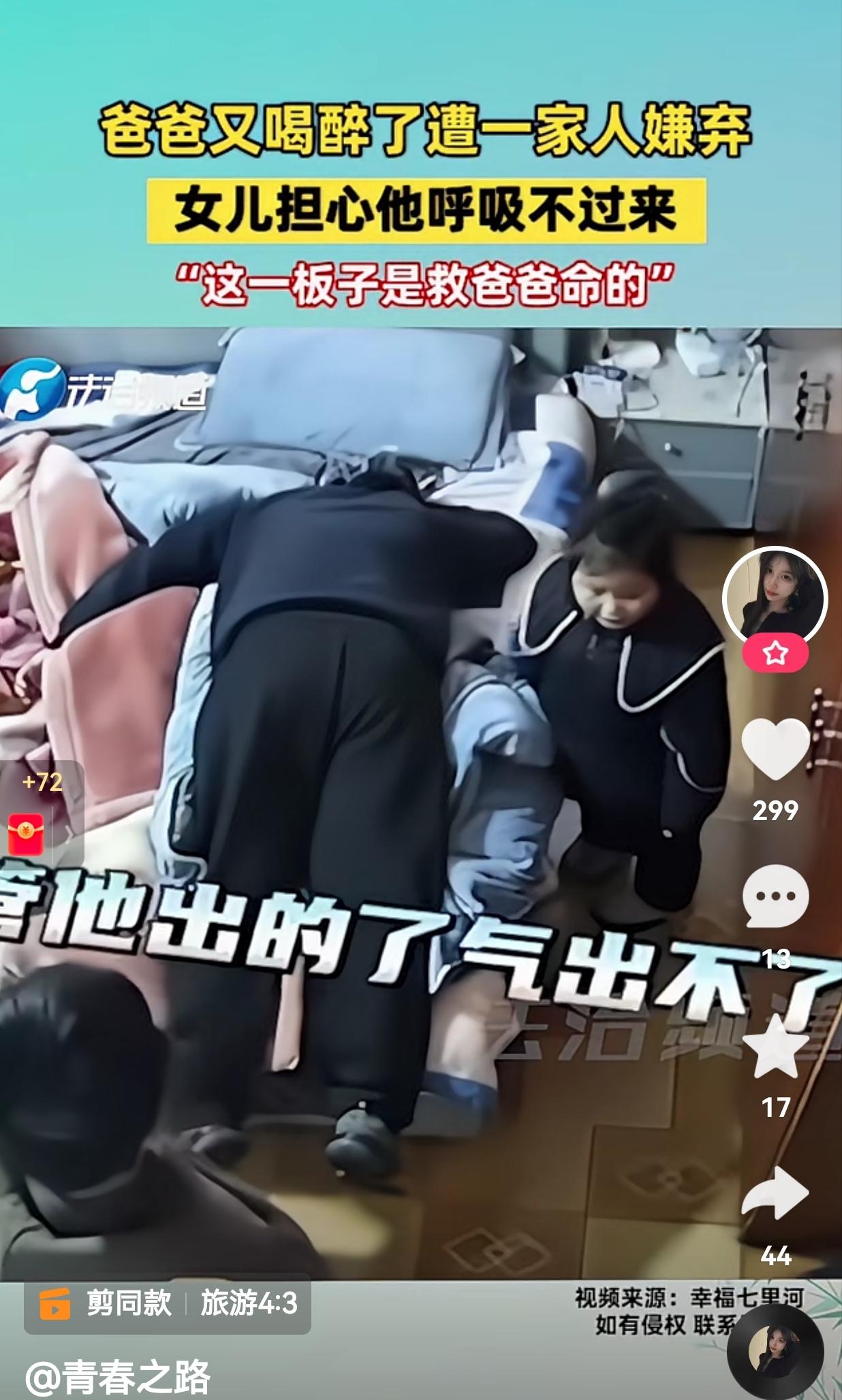 女儿是爸爸的贴心小棉袄,这一刻具象化了!虽说女儿打了爸爸一板子,视频中可以看出孩子的礼服还不小,但是,孩子也是为了爸爸着想呀!毕竟她太小了,根本翻不动爸爸,只能出此下策了! 爸爸跟朋友聚会,在临行前,家里人一再嘱托,聚餐可以,喝酒也可以。但是,你一定不能喝醉喝醉了太伤身体了! 男子嘴上答应的好好的,结果,在酒桌上还是经不住朋友的劝说,男子又喝醉了,不省人事了!还是在朋友的帮助下,才把他带回了家。 家人一看男子又喝醉了,很是气愤,遭到了一家人的嫌弃,妻子和儿子直接将男子拉倒了床了,男子顺势就趴在了床上。 一旁年幼的女儿看到了,担心爸爸的处境,就对哥哥和妈妈说:“这样睡觉不行的,这样睡觉他出不了气了。” 而哥哥和妈妈都在气头上,对于男子的死活,根本不放在心上,就说了一句狠话就离开了,妈妈说:“谁管他出的了气,出不了气。”说完径直离开了卧室。 孩子呢?年纪太小了,没有力气帮助爸爸翻身,怎么办呢? 孩子思来想去,就想了一个办法只见孩子拿了一个板子,狠狠地打了爸爸一板子,爸爸吓得一激灵。但是,好在清醒了过来,瞬间就翻身了。 网友看到后评论说,这孩子的真的很偏爱自己爸爸,是个孝顺和操心的孩子。 还有的网友说,看似很残酷,但是这一板子是救爸爸命的。 对此,你有什么看法呢?欢迎大家评论区讨论留言。