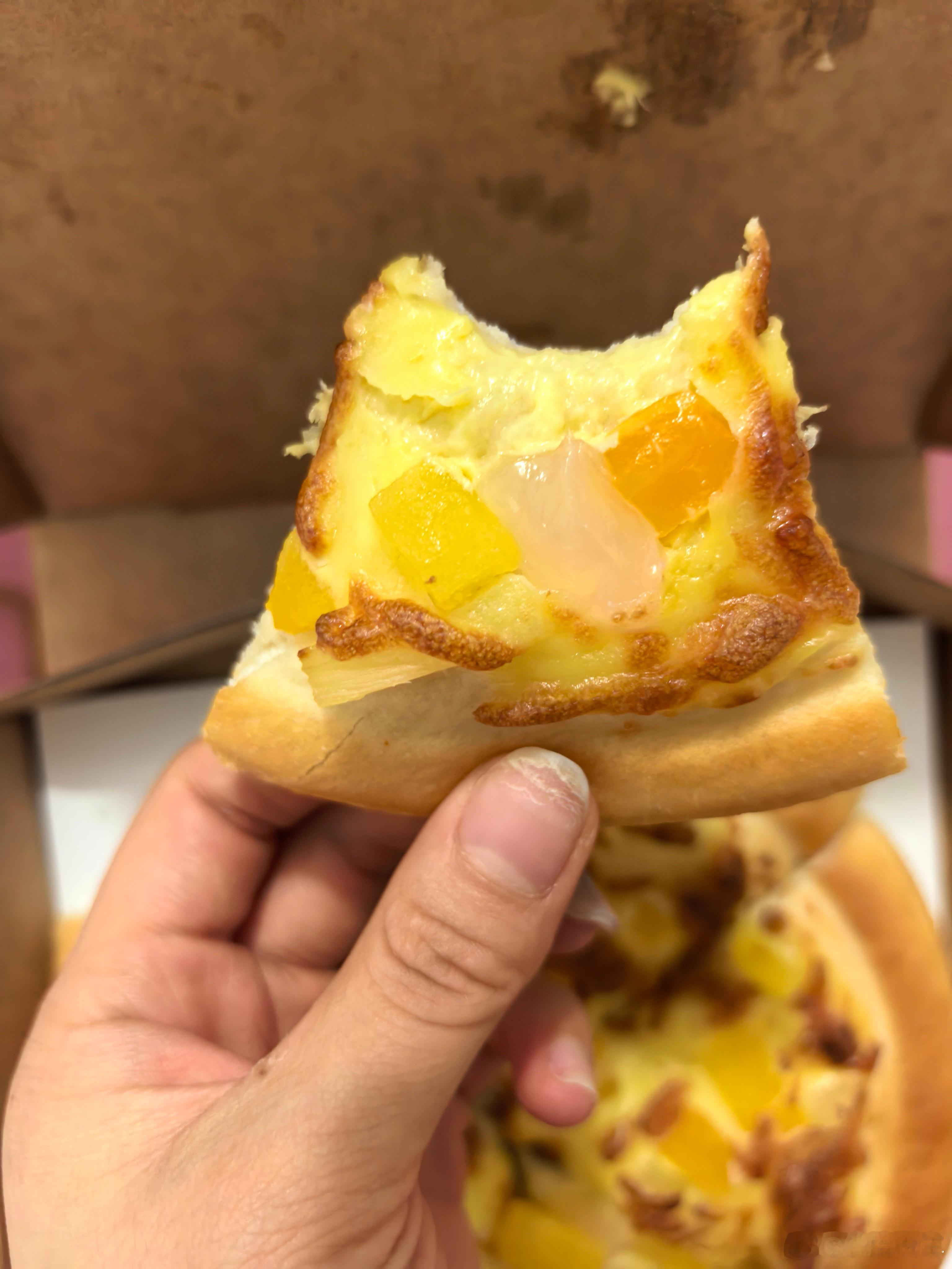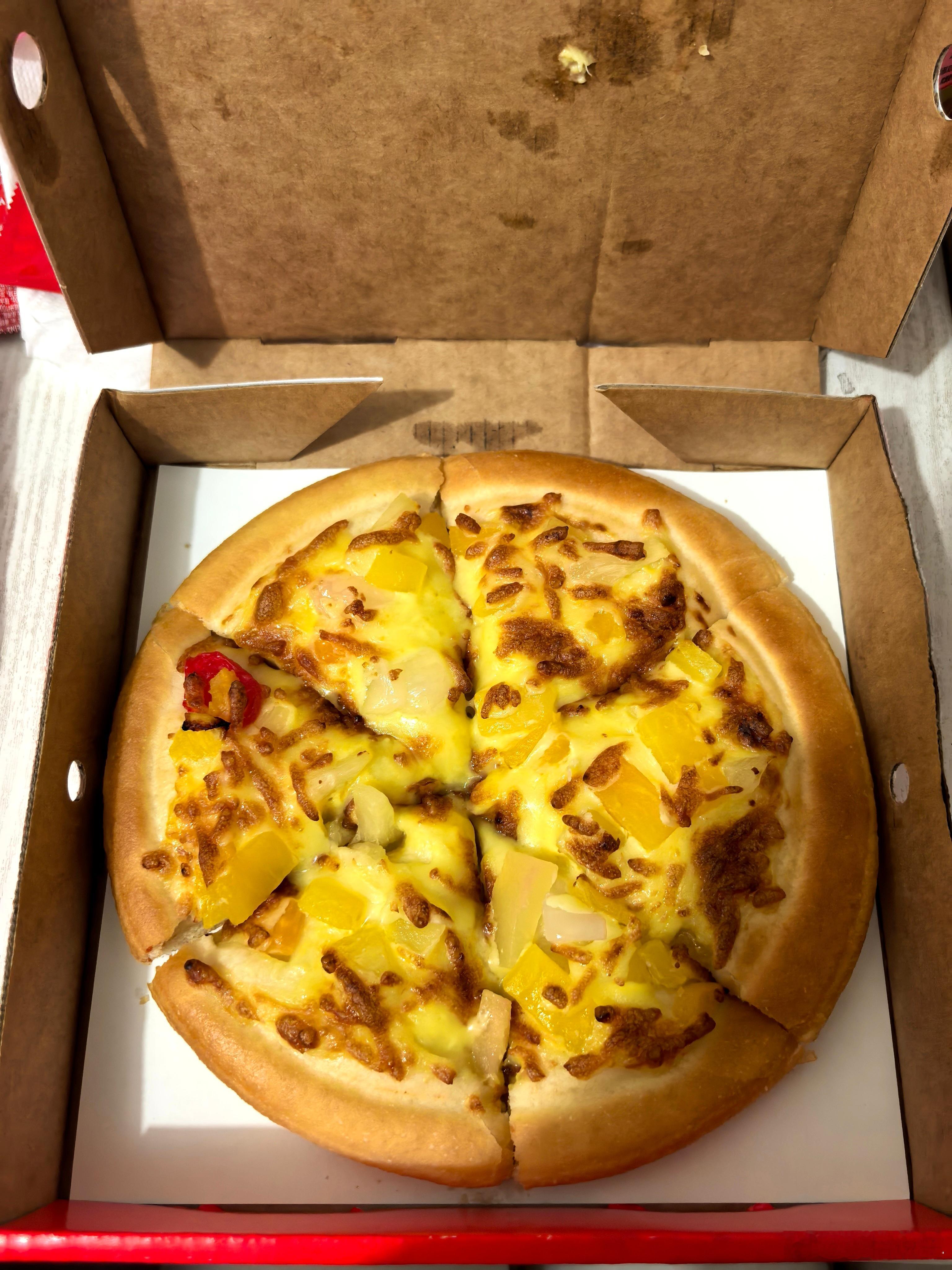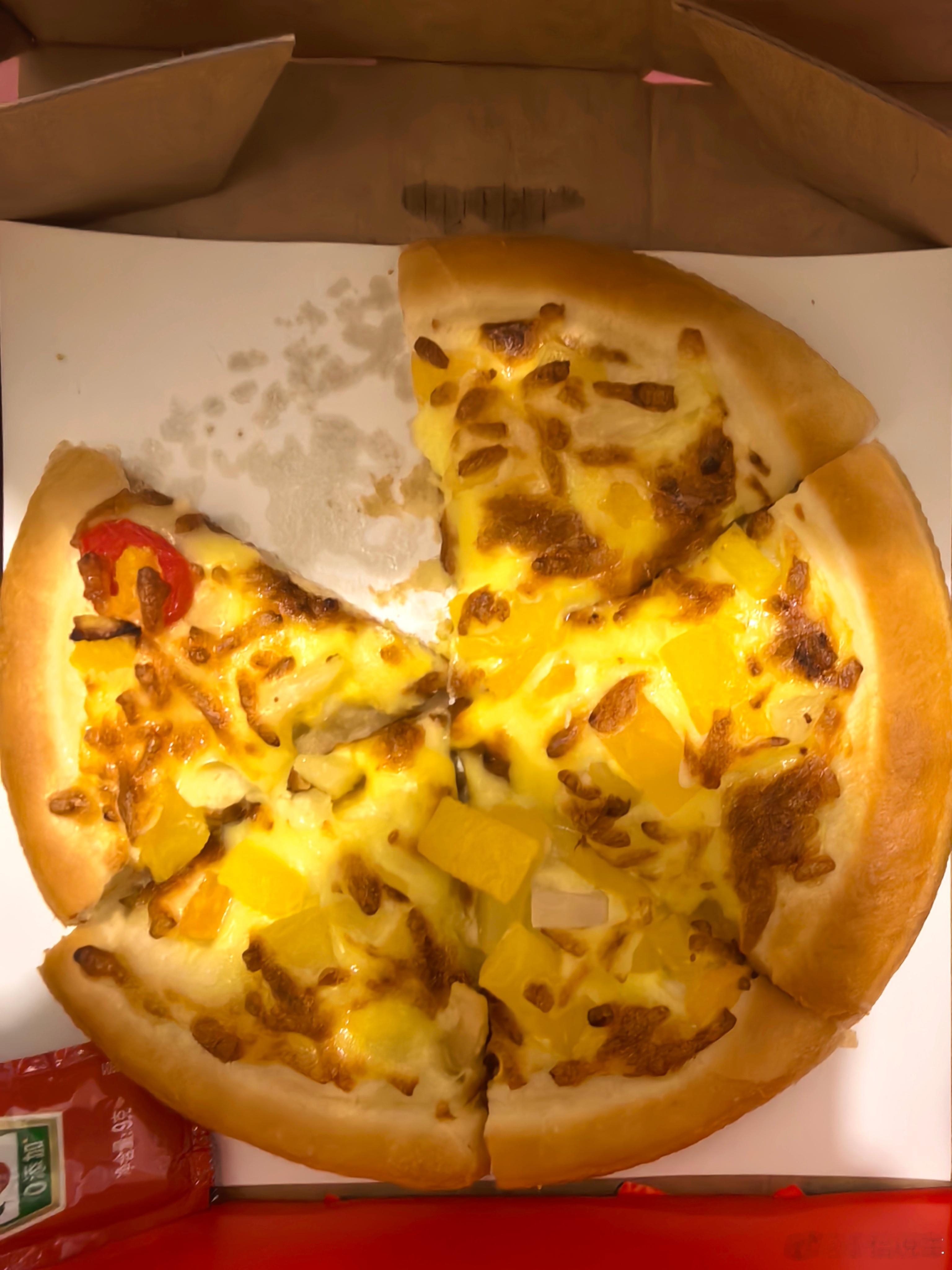 突然馋披萨了,点了个加黄桃的,是真好吃!你平时爱吃披萨不?