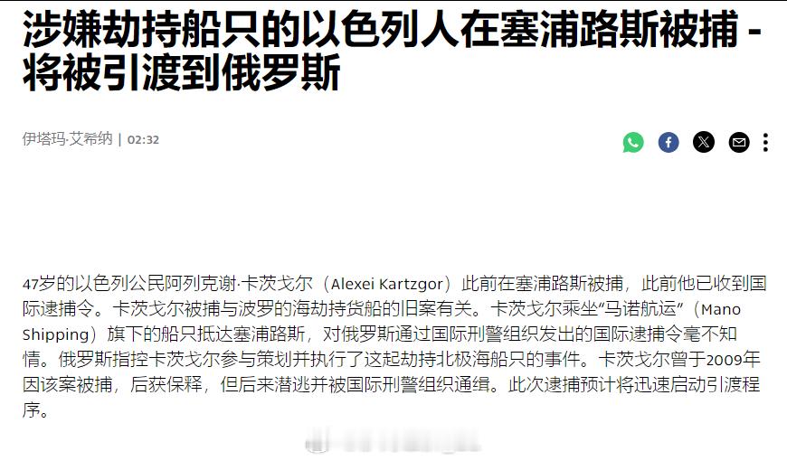 一名涉嫌参与北极劫船事件的斯拉夫裔以色列人在塞浦路斯被捕,他将被引渡至俄罗斯接受