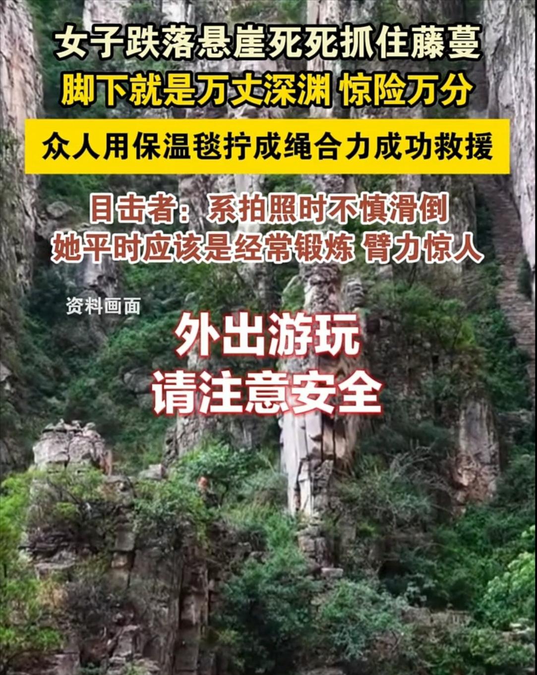 女子拍照掉到了悬崖上,太惊险了。山西长治,女子去英姑峡徒步旅行,和同行的人轮流拍照时,地面有点湿滑,不小心摔倒、失去平衡,摔下了山崖,悬在了半空中。同行女友用保温毯拧成一根绳,拴在石头上扔给了她,经过了30分钟才将她救上来。网友们说,到底是生命重要,还是拍照重要? 素材来源于:封面新闻2025-10-5 范先生和女子他们不是同行的人,他们是另外一拨,他看到了女子摔下去的全过程。 女子她们一行有七八个人在英姑峡,有一处悬崖峭壁上,延伸出去有一个平台,那里会有很多人拍照。 这些人也轮流上去拍,可是这几天的天气不大好,地面都比较湿滑,过去的人都站得比较靠后,没有硬要站在最外面。 女子去的时候不知道踩在哪里了,又站在前面,这一摔倒整个人就失去了平衡,朝外面冲了出去。 女子反应还快,掉下去的瞬间,她就下意识地抓住了悬崖上的藤蔓,牢牢地把自己的身体固定在了那个位置。 她整个人都比较清醒,看样子是经常锻炼的,一般出来徒步的人,平时身体都比较好。她并没有大吼大叫,而是大声喊自己的同行,说自己没有受伤,让他们想办法救自己。 范先生在不远处看到后,也惊出了一身冷汗,女子的下面可是300多米高的悬崖峭壁,要是她当时没有抓住藤蔓掉下去,可能早就没有呼吸了。 要是女子被恐惧冲昏了理智,在悬崖上大吼大叫,同行的人实施救援也会很难。 因为他们没有带救援的器材,如果有绳子,直接抛下去让女子拉住,上面七八个人再使劲往上拉,那么问题也好办。 关键是他们没有,最后都纷纷拿出各自的保温毯,连接在一起,扭成一根绳,拴到后面的大石块上,再扔给女子,把她拉上来了。 想到用保温毯的时候,时间都已经过去十几分钟了,因为他们是在一个一个地排除,看用哪种方法最好。 幸好女子在那里不哭不闹,稳稳地抓住藤蔓悬空在那里。 要是她情绪不稳,上面的救援工作将会更加乱成一团。 幸好他们也是经常出去徒步的,可能时常会经历这些突发的事件,遇到情况时相互都很信任对方,都在积极施救,也在积极等待施救。 要是双方没有信任度,女子悬在半空中,生怕同行的人走了,肯定心里发慌。 那么同行的人即使有责任心,也怕女子的体力支撑不了那么久,他们也会更加没有定力和智慧去思考更好的办法。 所以这七八个人可以说是相互信任的,这一点非常好。 但反过来说,真的要在天气不好的时候去徒步吗? 或者说真的是在遇到风景特别美,但地面又非常湿滑,外面又是悬崖峭壁的地方,一定要去留恋拍照吗? 就不能站远一点吗?就不能不凑到人跟前,直接拍风景吗?到底是生命重要,还是拍照留念重要?这成了大家思考的问题。 不过结果是好的,只是告诫这些徒步的人,你们身后还有家人,还有朋友,千万不要图一时的快乐,让自己的家人和朋友背负一生的悲痛啊。 一、女子自己踩滑摔下悬崖,责任得自己担吗? 《民法典》第一千一百七十六条:自愿参加具有一定风险的文体活动,因其他参加者的行为受到损害的,受害人不得请求其他参加者承担侵权责任;但是,其他参加者对损害的发生有故意或者重大过失的除外。活动组织者的责任适用本法第一千一百九十八条至第一千二百零一条的规定。 徒步拍照算有风险的文体活动,女子自愿去的,也该预见湿滑危险。没人推她、害她,就是自甘风险,主要责任得自己扛。 二、同行的人没救成她,用赔吗? 《民法典》第一千一百七十六条:自愿参加具有一定风险的文体活动,因其他参加者的行为受到损害的,受害人不得请求其他参加者承担侵权责任;但是,其他参加者对损害的发生有故意或者重大过失的除外。 同行的没故意坑她,也没犯大错,还拿保温毯救人了。按条例,只要没故意或重大过失,就不用赔。 三、同行的人没带救援器材,算失职吗? 《民法典》第一千一百七十六条:自愿参加具有一定风险的文体活动,因其他参加者的行为受到损害的,受害人不得请求其他参加者承担侵权责任;但是,其他参加者对损害的发生有故意或者重大过失的除外。 普通徒步不是专业探险,不带专业器材很常见,这不算重大过失。他们已经想办法救了,不算失职。 四、要是同行者见死不救,用担责吗? 《民法典》第一千一百七十六条:自愿参加具有一定风险的文体活动,因其他参加者的行为受到损害的,受害人不得请求其他参加者承担侵权责任;但是,其他参加者对损害的发生有故意或者重大过失的除外。 如果同行的故意不救,或者明明能救却故意耽误,就属于有重大过失,得承担相应责任。但只是没专业器材救不了,不算。 对于此事,大家又是如何看待的呢?