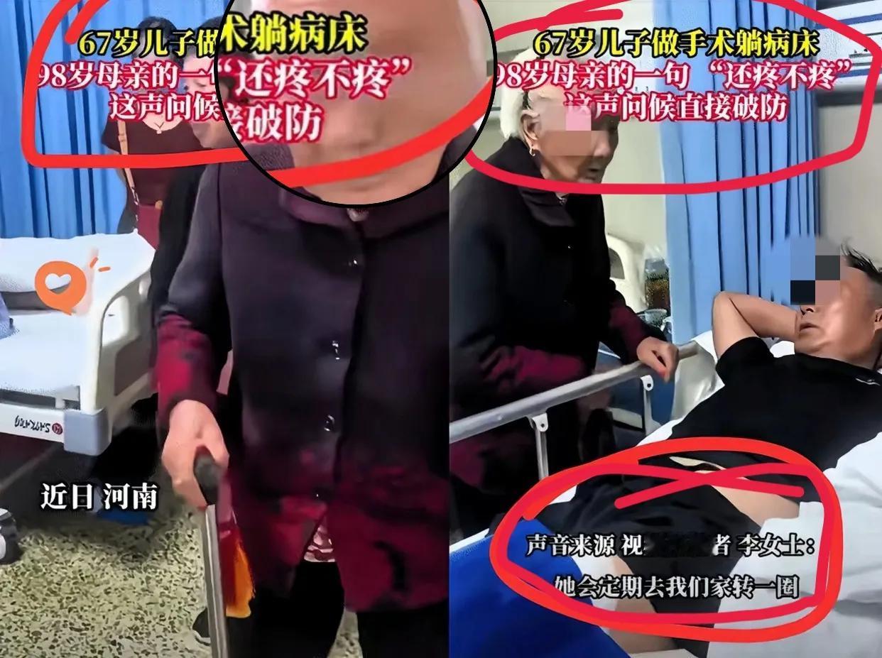 破防了! 近日,河南67岁男子做完手术躺在病床上。98岁妈妈拄着拐走进来, 第