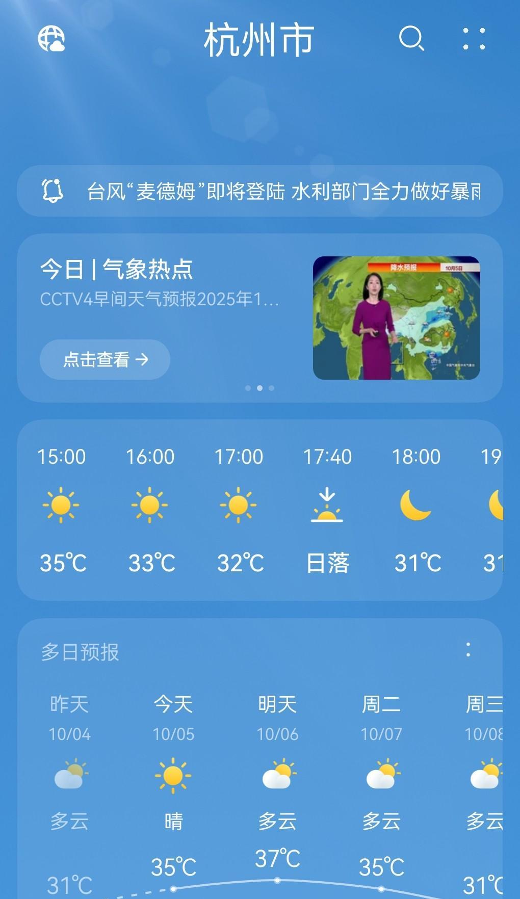 你以为33度是今天苏州的最高温度?错,现在你去外面站一会儿,体感温度绝对有40度,火辣辣的太阳,能把你晒到六亲不认。 今年国庆节的这种热法,好像历史上也找不到第二了!尤其是对整个江浙沪来说,也是绝无仅有吧。据说,浙江的大部分地区从今天开始将连续开启37-40度的高温,毗邻的上海也差不多。这哪里是秋天,这分明是“夏天”赖在“秋天”的家里,久久不肯离去。而“秋天”呢?打也不是,骂也不是,那就只好收拾一间屋子让“夏天”长居了。 本以为最新生成的第21号台风麦德姆会给江浙沪降降温,但是,麦德姆偏偏不来江浙沪,你看,连台风见到江浙沪的“夏天”都要跪着走。看来,江浙沪的这个“夏天”真的要在这里过年了。
