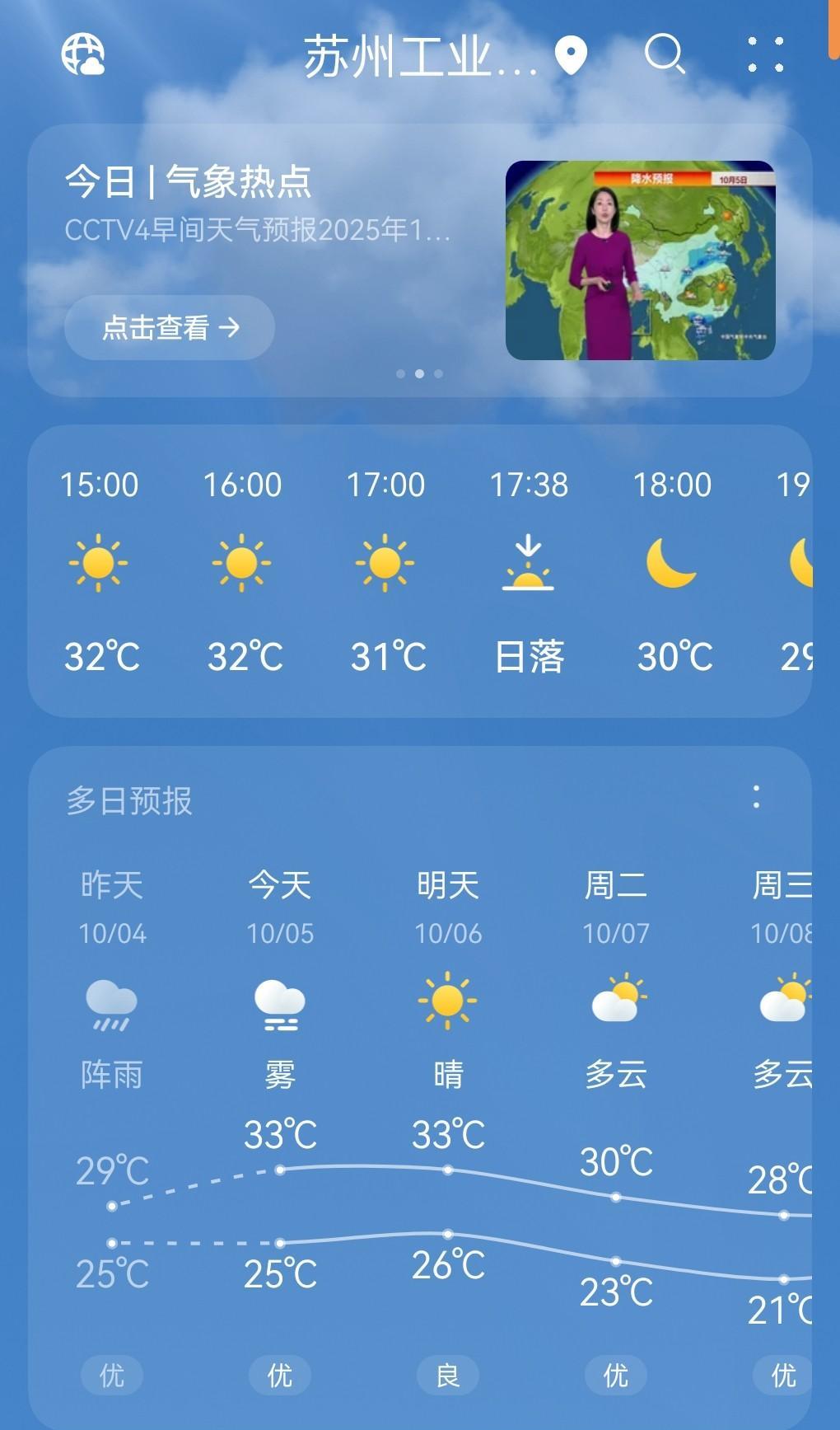 真不知道天气预报这33度怎么测出来的。今天吴江至少35,36度。