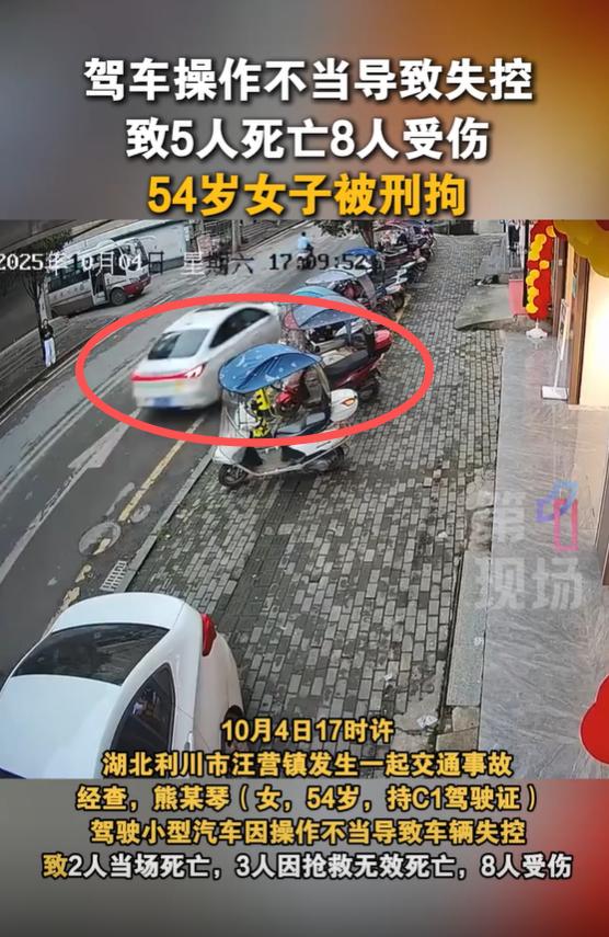 国庆期间,5死8伤!十几个家庭瞬间破碎崩塌,都源于一名54岁女子驾驶汽车操作不慎!车祸猛于虎啊,真是人在街边走祸从身后来! 10月4日下午17时10分许,湖北利川汪营镇。 街面监控镜头中,一辆白色轿车忽然疾冲了出来,速度之快令人咂舌,顷刻间前方响起巨大的撞击声,人们的惊呼声、街面一片狼藉…… 根据警方的警情通报显示,肇事司机是54岁的熊某,由于驾驶操作不慎撞向行人,造成了5死8伤的严重后果! 什么叫“操作不慎”?开车的人大概都知道,又是油门当刹车踩了?据说,这辆车窗上还贴了“实习”字样,莫不是熊某还是个新手? 无论你是不是新手,一声巨响之后造成十多个家庭顷刻间破碎,你就是有天大的理由也无济于事了…… 由于车祸场面十分惨烈,按照头条上的规则,这些照片是不可能放出来的。 有网友表示,自己当时就在现场,印象最深刻最揪心的据说是车辆撞上一个骑电动车的女人和她后座上的小女孩!女孩小小的,大概只有几岁的样子,倒在地上一动不动。 5死8伤,多么惨烈的车祸! 可以想见,54岁的肇事司机熊某,必须也一定会负上刑事责任“进去”了!不仅如此,5条人命的经济补偿又会是一个天文数字……还有8个躺在医院的重伤员! 都说车祸猛于虎,每个人动动嘴皮子就能说,但是要真正记在心里才最要紧! 现在还是国庆期间,明天就是中秋之夜! 十多个家庭因为这突如其来的车祸破碎不堪,什么中秋、什么团圆……几乎再和他们无缘。甚至以后得每个中秋都会变成捅刺家人心口的刀子! 这一个个血淋淋的教训,能让我们引以为戒吗?
