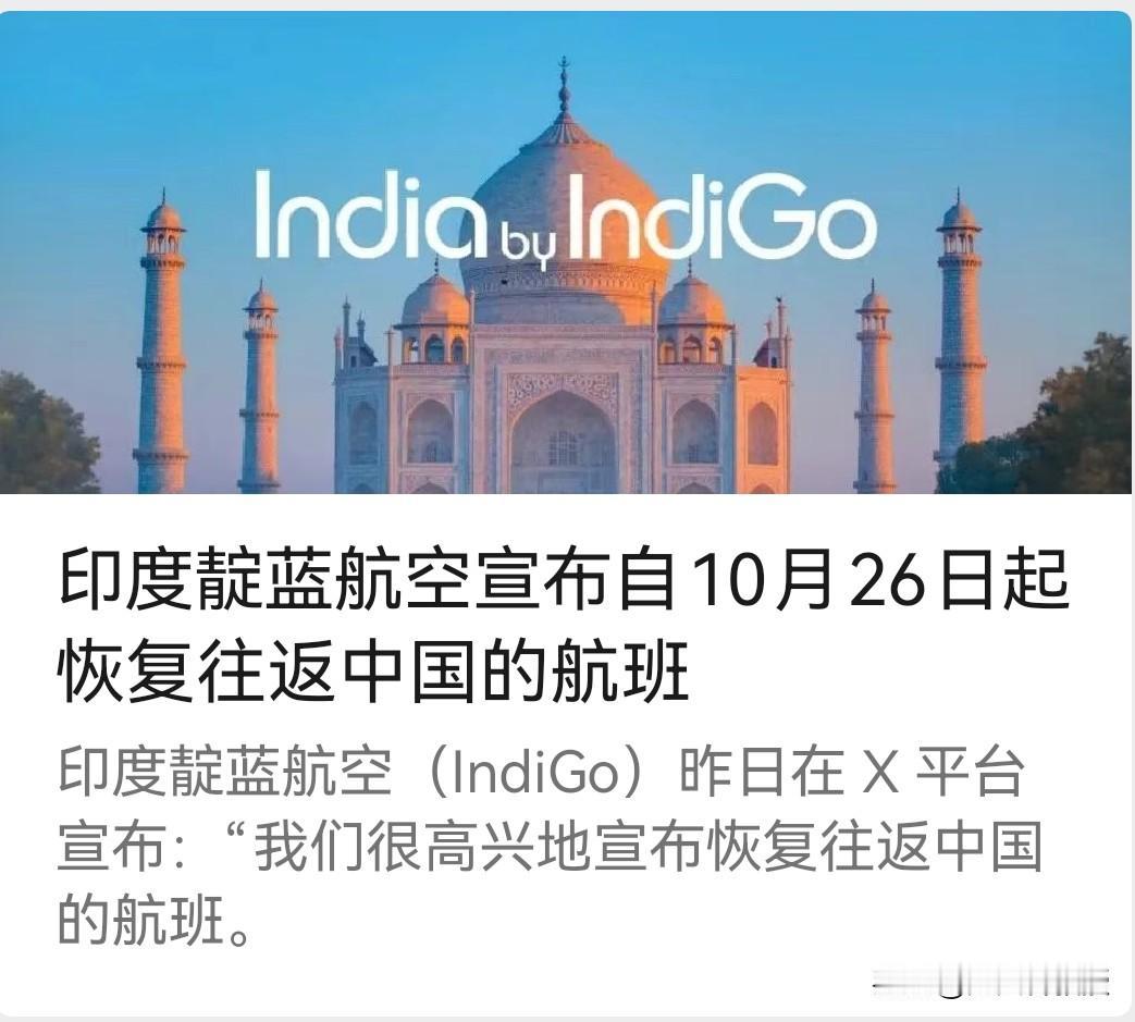 中印直航恢复,主要服务印度人! 印度宣布将于10月26号起恢复到中国的直航航班,第一班由印度靛蓝航空公司执行加尔各答到中国广州的航班,每周一班。两个14亿人口的大国终于恢复直航航班了。 不过,由于印度政府对中国公民的签证控制得非常紧,要求的手续繁琐,材料太多,愿意去印度,能去印度的中国人非常有限。即使直航航班开通,主要还是为印度人服务,可能99%的乘客都是印度人。 简化对中国公民的签证程序,是否有大量中国公民获得印度签证,是检验印度是否真心恢复对华关系的关键指标。