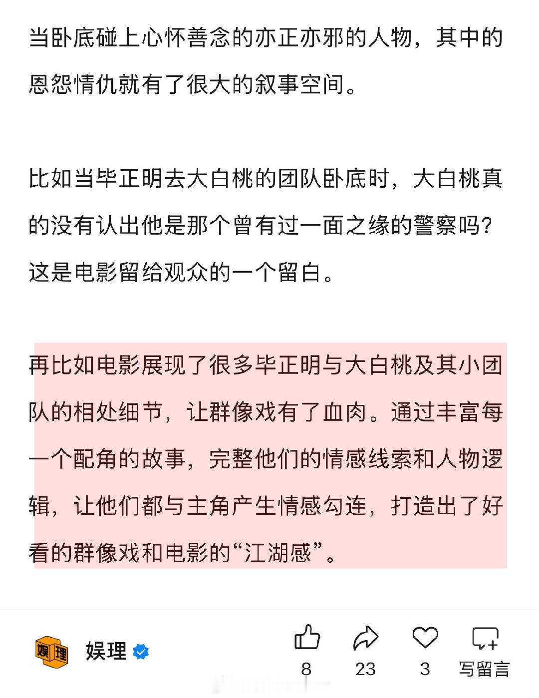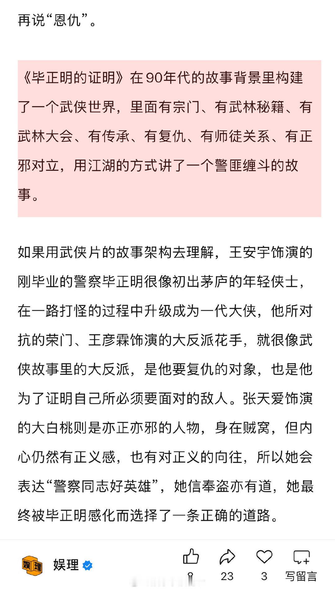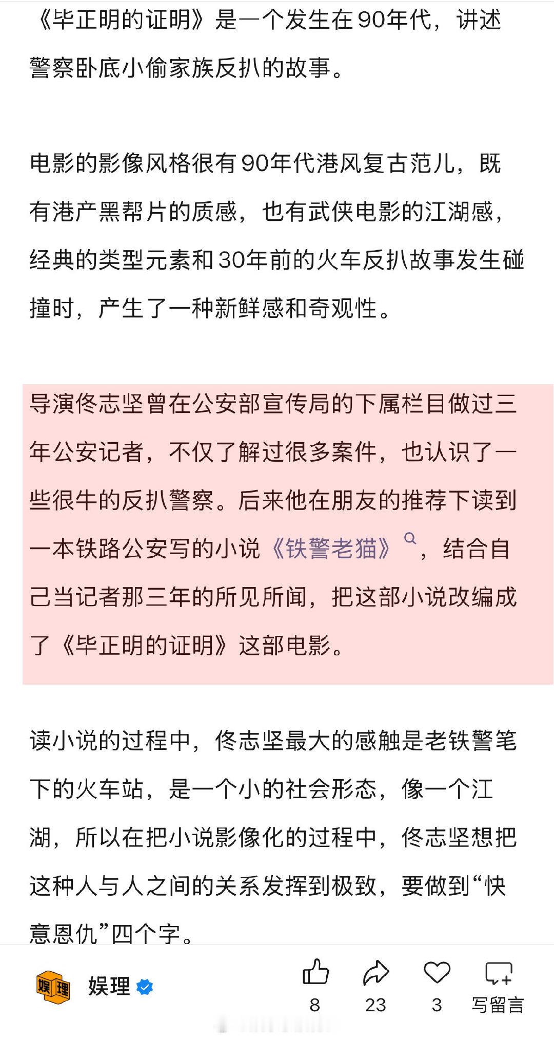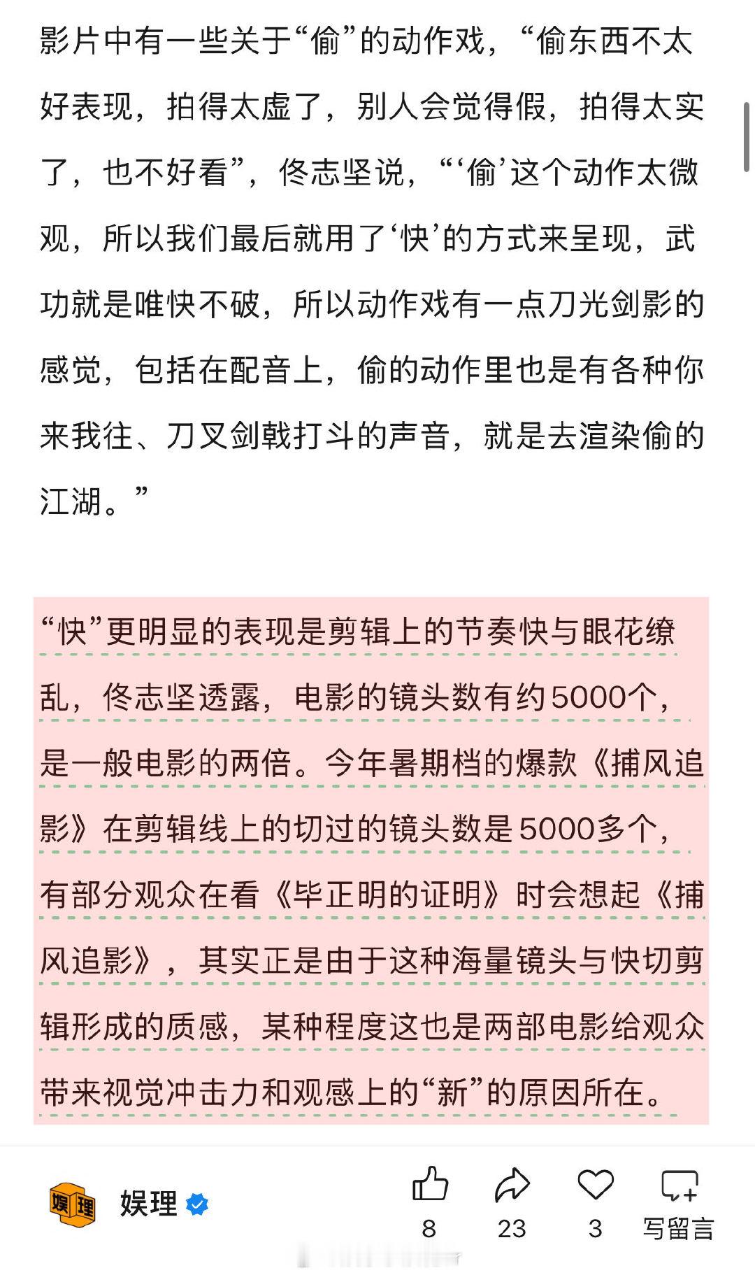 导演说选王安宇是选对人了 毕正明的导演谈王安宇的破碎感 导演佟志坚透露,《毕正明的证明》镜头数有约5000个,是一般电影的两倍。有部分观众在看片时会想起《捕风追影》,其实正是由于这种海量镜头与快切剪辑形成的质感,某种程度这也是两部电影给观众带来视觉冲击力和观感上的“新”的原因所在…娱理独家↓