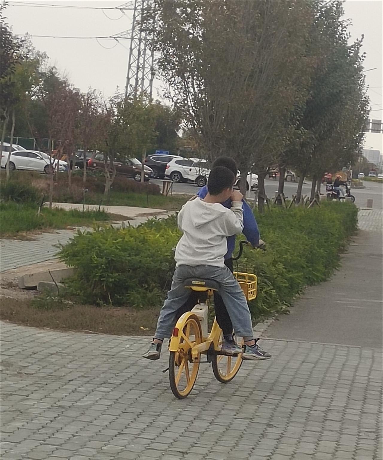 不可否认,现在的孩子真是聪明。这不?停放在人行道上的锁着的共享单车自行车,被这里