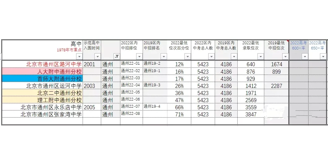 一般来说,“示范高中”就是各区的优质教育资源了,通州有三所示范高中:潞河中学、运河中学和永乐店中学,分别是2001、2003和2005年入围的。同时,这几年通州大力引进市区教育资源,人大附中通州校区,北京学校,首师大附中通州分校,北京二中通州分校和北理工附中通州分校等,其中2022年后三所新设立的中学招生能力挤进了三所示范高中的“势力范围”。同2019年相比,通州区的优质教育资源增加了75%,而同期中考人数只增加了30%。