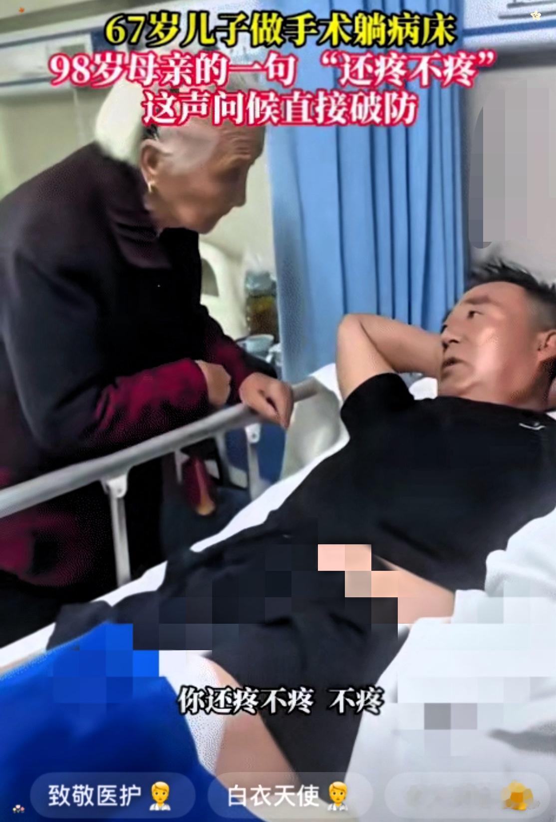 破防了!河南,67岁男子做手术躺病床上。突然,98岁母亲来看望,问他: “还疼不疼。” 他说: “不疼。”网友: 不管多大岁数,有母亲的牵挂,就是幸福的。 你看这画面多戳心——67岁的儿子躺在病床上,98岁的老妈拄着拐挪进来,第一句还是“还疼不疼”。 儿子怕妈担心故意隐瞒,可妈心里跟装了雷达似的,两次没见着人就猜出事,非要来医院看看才放心。 这哪是简单的探望啊,分明是母亲的爱从来不管孩子多大。 就像我爸当年摔断腿,也瞒着我奶奶,可老人家一瞅儿子没回家,立马追问不停,后来知道了还掉眼泪要炖排骨汤。 98岁老人头发整齐、思路清晰,不光是身体好,更藏着家里的好家风。 要是晚辈不孝顺、家里不和睦,老人哪能这么舒心长寿? 这种代代相传的牵挂和体贴,才是一个家最牢的根。 你家有没有这种“不管多大,在爸妈眼里还是孩子”的小事?评论区说说呗!