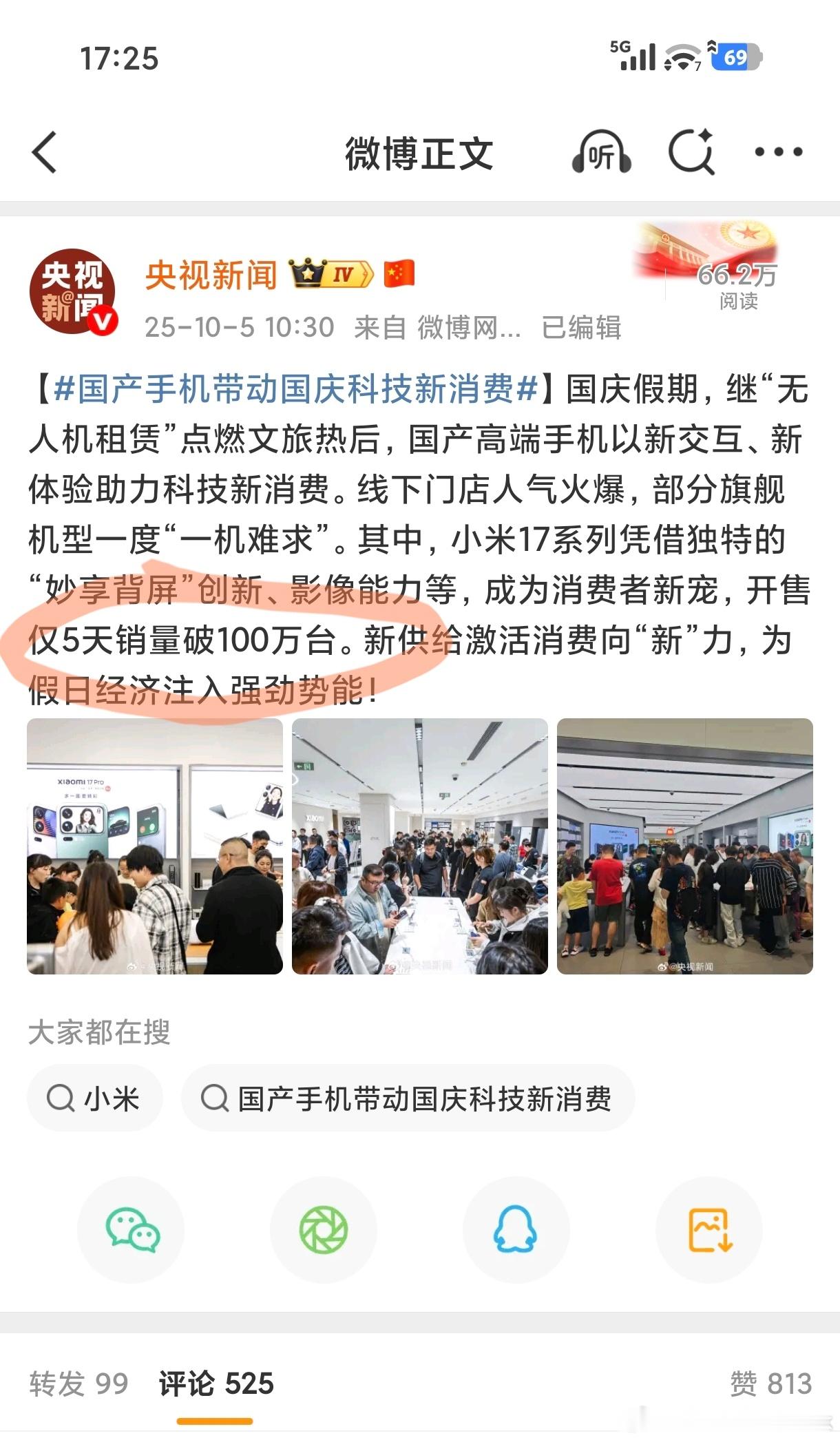小米17系列是真猛啊?开售5天,销量破一百万!8天,激活量百万达成[举手]