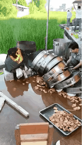 这是什么情况?感觉像是蒸锅突然倒塌了,里面的东西撒了一地,这应该都是吃的东西,掉