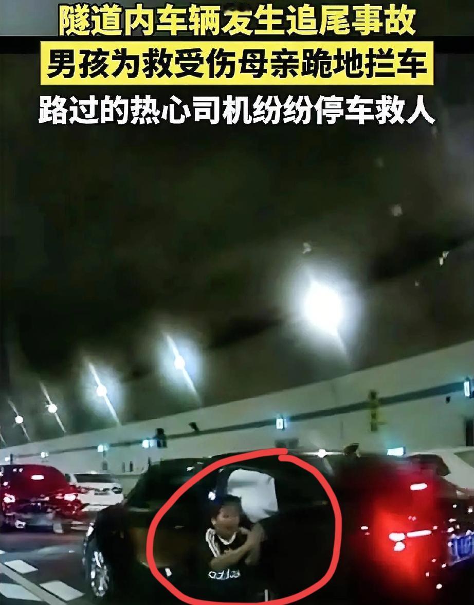 真的泪目了! 10岁男孩隧道内求助, 只为救车内受伤昏迷的母亲。 10月4日,在广州的一条隧道里,一位母亲驾驶汽车发生了追尾事故,安全气囊弹出并当场昏迷。车内还有她的三个孩子,一个10岁的小男孩和两个妹妹。 这个小男孩为了救车内受伤昏迷的母亲,浑身颤抖地跪倒在车门前,双手作揖,哭着向后方的车主们求助。 车内的妹妹则是打开车门想要去帮助妈妈。 好在后面的司机很快注意到了这一幕,纷纷前来帮助,合力之下将这位母亲救出,交警也及时赶到现场。幸运的是,这位母亲确诊为脑震荡,没有大碍。 感谢好心人出手帮助母子四人,更要为孩子们点赞,小小年纪如此勇敢的想尽办法救助母亲,真的让人泪目了!