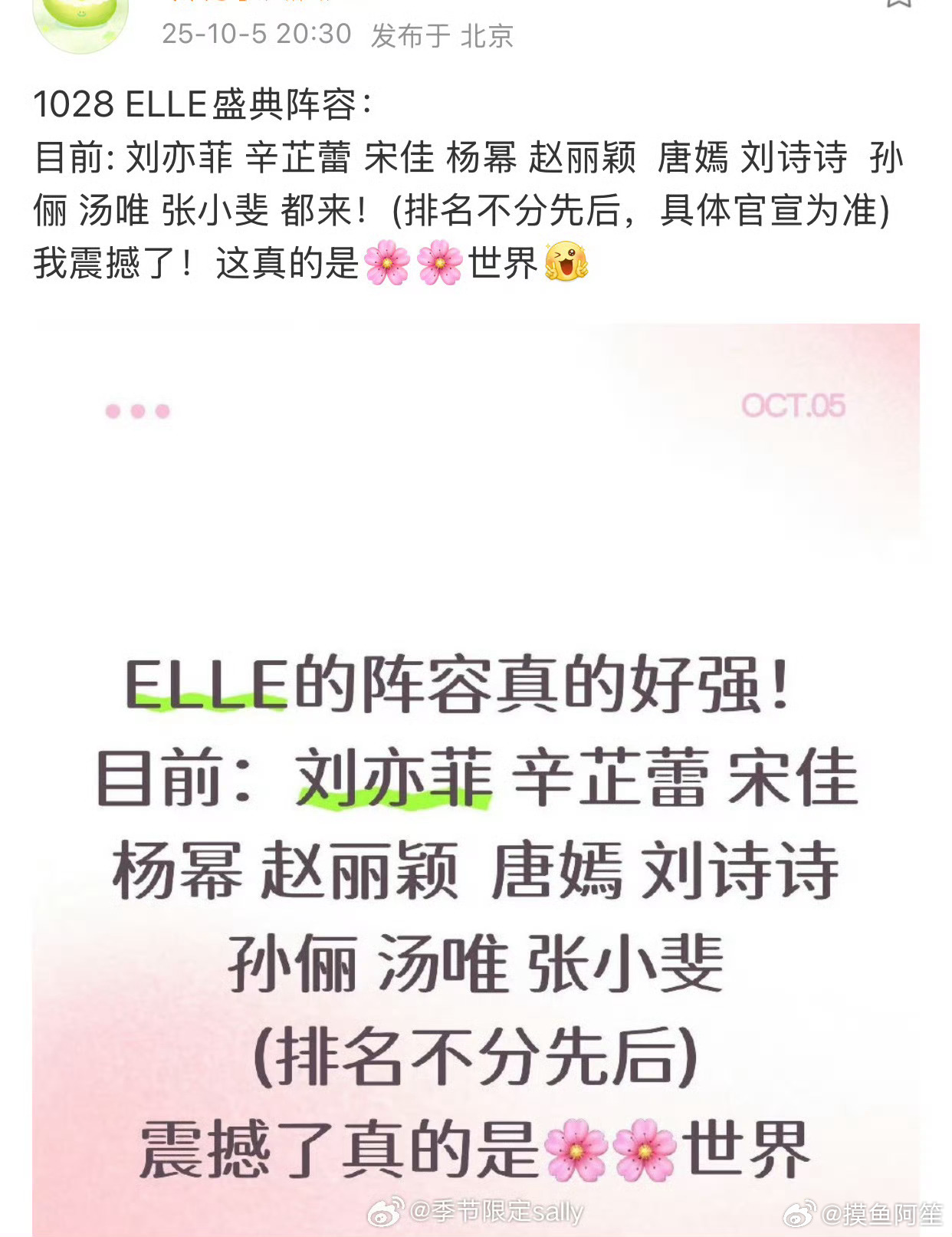 ELLE盛典阵容: 刘亦菲 辛芷蕾 宋佳 杨幂 赵丽颖 唐嫣 刘诗诗 孙俪 汤唯 张小斐 ……