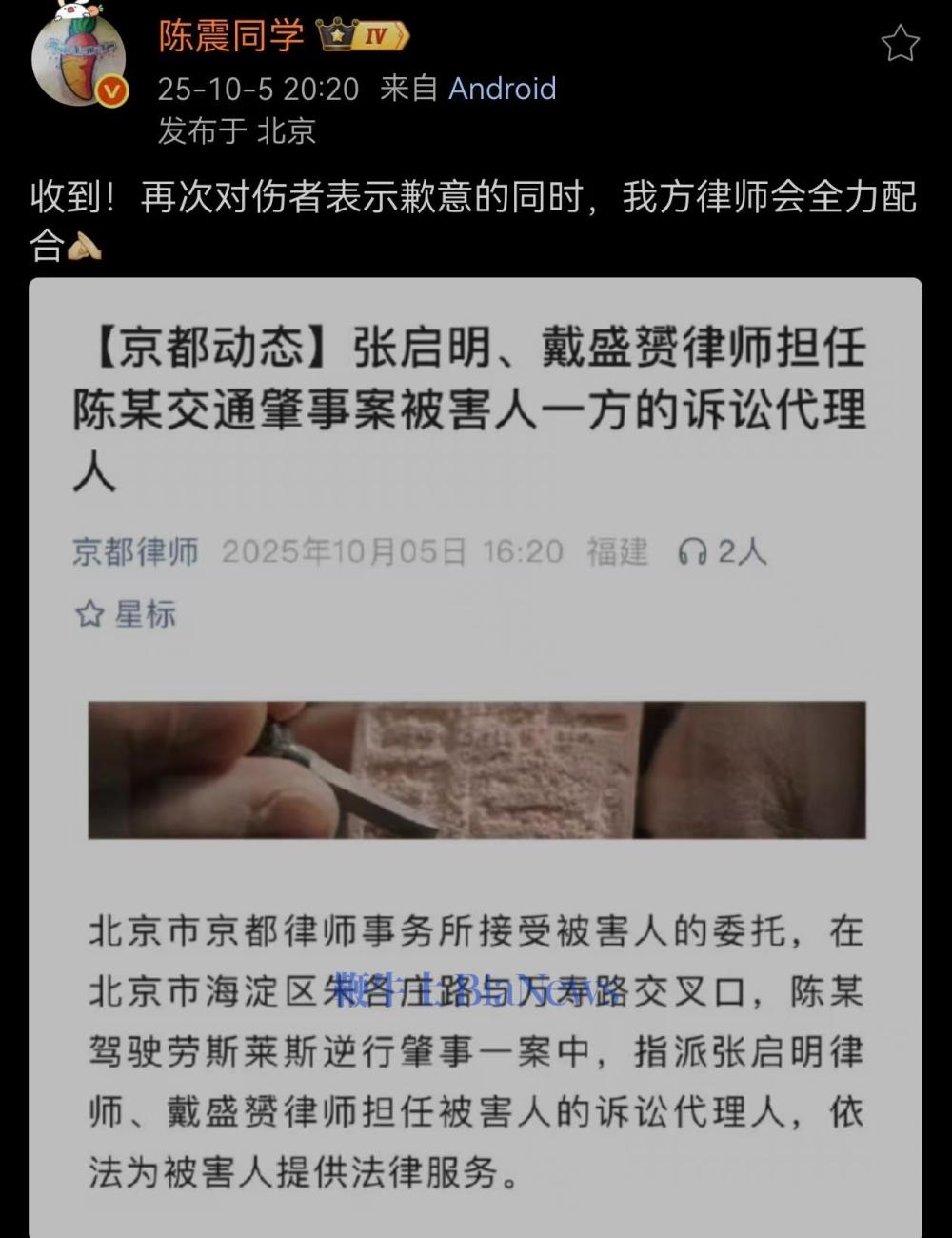 10月5日,北京京都律师事务所发文称,接受被害人委托,指派张启明、戴盛赟律师为陈震驾驶劳斯莱斯逆行肇事一案中被害人的诉讼代理人。