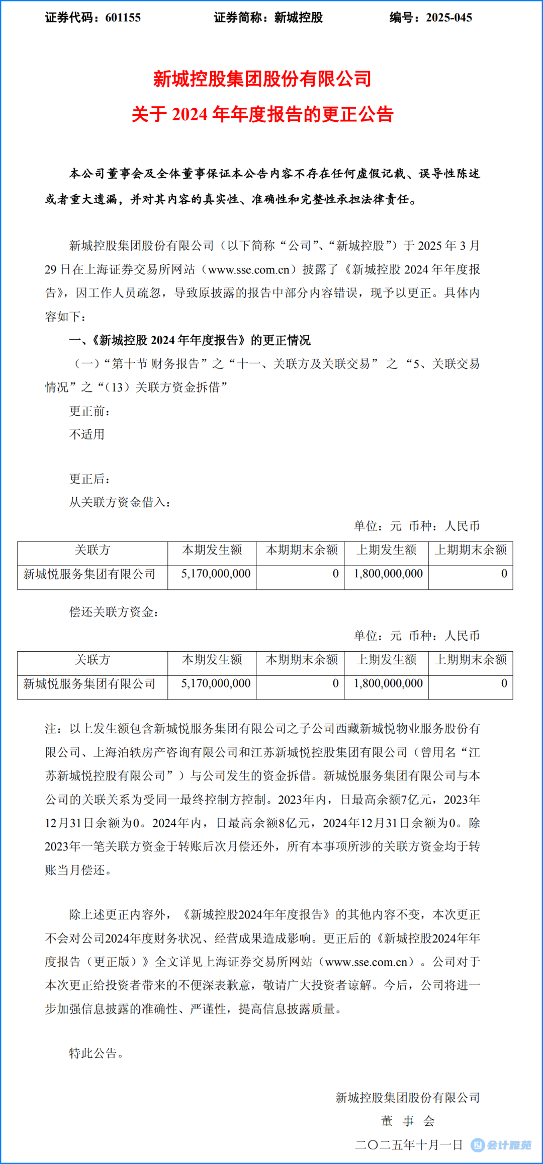 通过对上述管理层提供的银行对账单记录的检查,普华永道发现其中两个银行账户在2024年度存在与公司某一关联方的资金往来,涉及的资金流出及资金流入金额分别合计人民币22.7亿元。此外,普华永道发现上述关联方资金往来交易并未在集团相关银行明细账中进行会计记录,新城悦服务亦未按照关联方交易的要求履行相关的审批和披露程序。