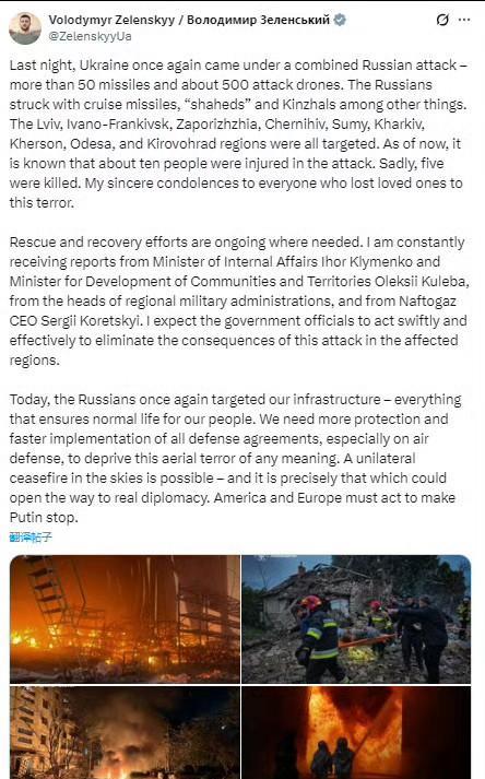 在俄军接连发动大规模空袭后,泽连斯基再度抱怨起来。他称俄罗斯人发射了50多枚导弹