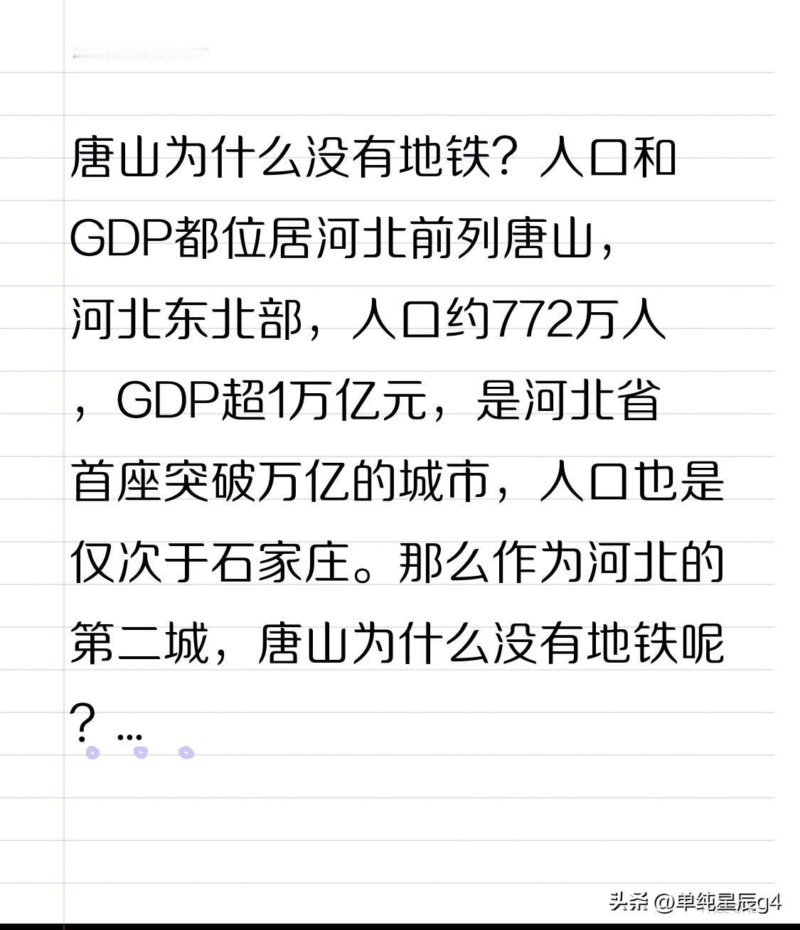 唐山为什么没有地铁?人口和GDP都位居河北前列 唐山,河北东北部,人口约772万人,GDP超1万亿元,是河北省首座突破万亿的城市,人口也是仅次于石家庄。那么作为河北的第二城,唐山为什么没有地铁呢?而且唐山也是我国工业基地,轨道交通产业基地。 一方面,地铁建设规划受到严格控制,对城市财政以及客流量有明确要求。如山东烟台,福建泉州等都不满足要求而不能要建设地铁,而这些城市也开始规划建设市域铁路以及城际铁路,如龙烟市域铁路和厦漳泉城际铁路。 另一方面,地铁的建设成本较大,而且唐山的地质较复杂,建设难度和安全隐患也较大。城市布局又是多个城区组团式布局分散,单一组团门口就显得不那么充足,难以形成稳定的客流强度,支撑轨道交通运营。